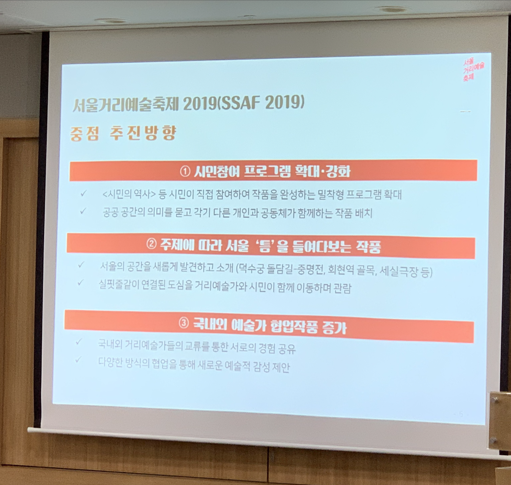 서울거리예술축제 2019 중점 추진방향으로는 6가지 언급됐습니다. 요약하면 이렇습니다.