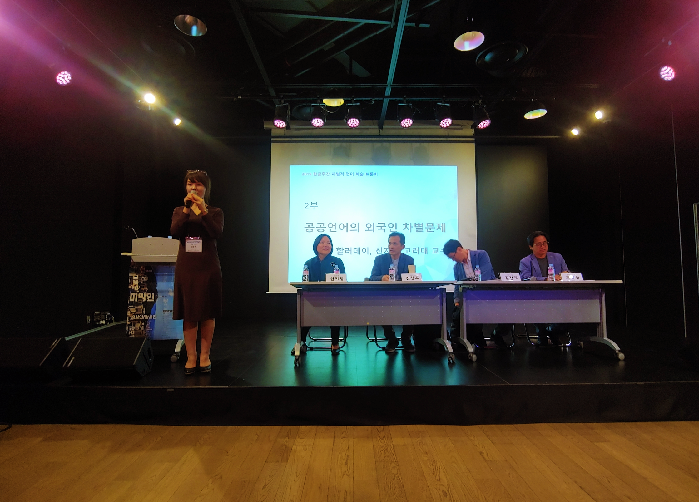 한글날 하루 전이었던 지난 10월 8일 서울 시민청 바스락홀에서 2019 한글주간 행사의 일환으로 펼쳐진 차별적 언어 학술토론회 개최됐습니다. 공공언어의 차별언어 관련 문제를 토론하기 위한 목적으로 진행됐습니다. 이 행사는 지난해에 이어 올해 두 번째를 맞이했습니다. 차별적 언어 학술토론회 2년 연속 시민청 바스락홀 진행된 것은 그만큼 한국 사회에서 언어를 통한 차별이 만연하다는 것을 알 수 있습니다. 알고보면 특정 대상을 차별하는 언어는 한국 사회에서 낯설지 않습니다. 그런 언어를 되돌아보는 시간을 가졌습니다.