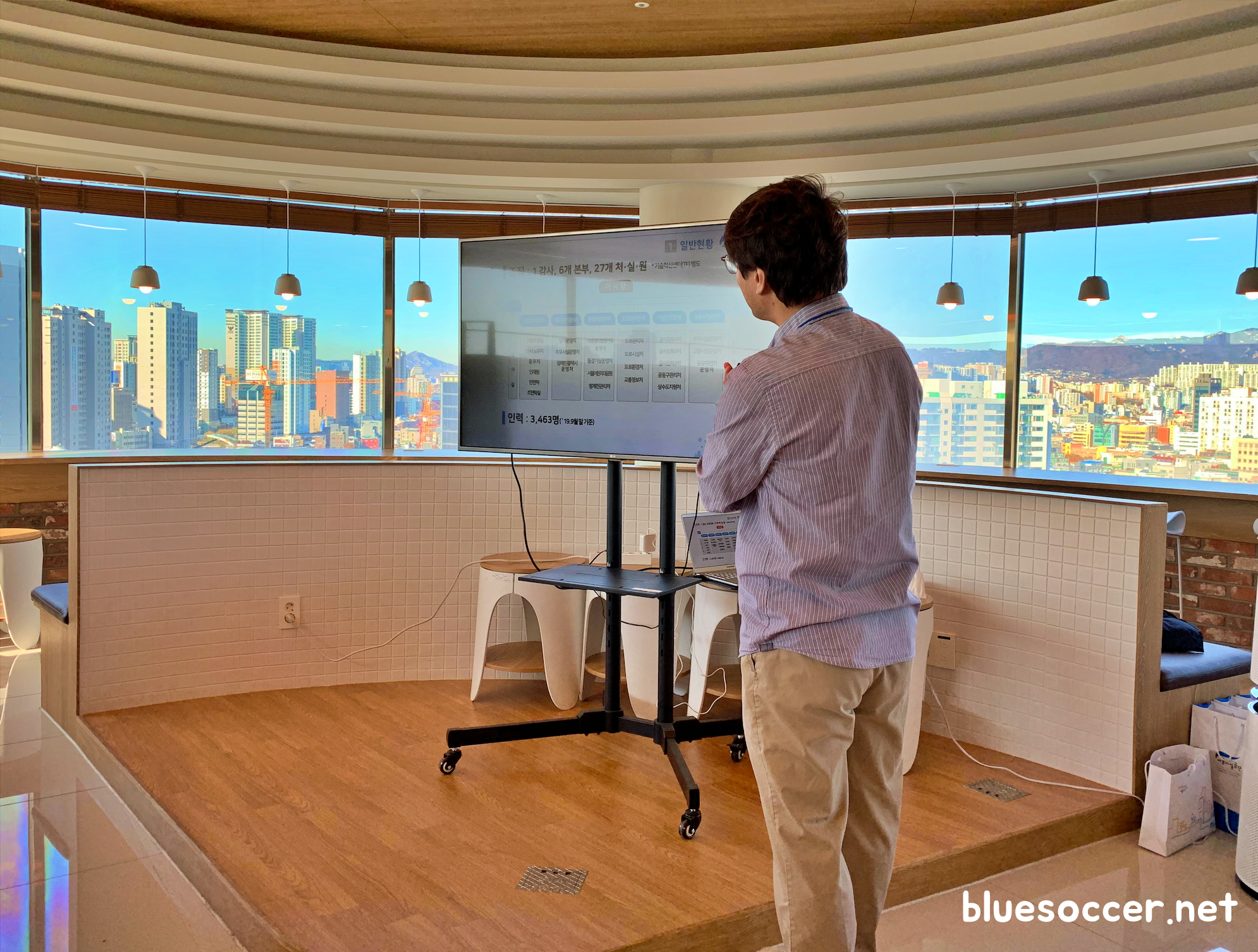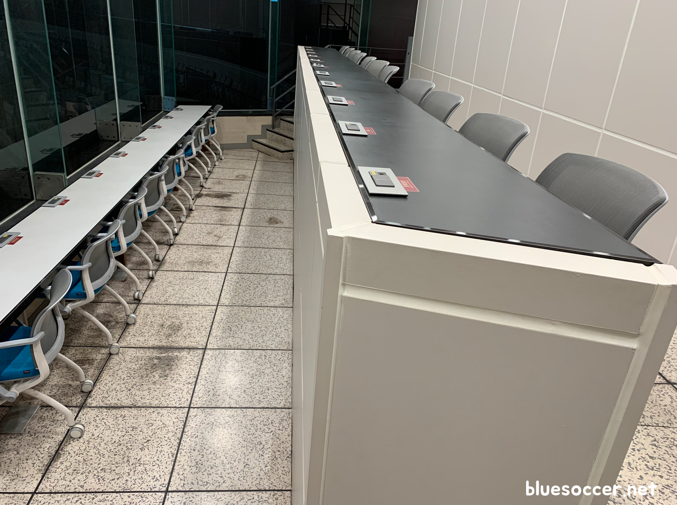 기자실 모습도 봤습니다. 사진에서는 2열의 모습을 담았는데 실제로는 4열 정도 됩니다. 사진에 있는 기자실 테이블 그 위에 1열, 옆에도 1열이 더 있습니다. 제가 지금까지 찾았던 축구장 기자실에 비해서 테이블 열 사이의 높이가 커보였습니다. 고척스카이돔에서 실내 야구 경기가 진행되는 것처럼 기자는 실내에서 야구 경기를 취재할 수 있습니다. 선수 뿐만 아니라 기자도 미세먼지, 우천, 폭염, 한파 걱정 없이 야구 경기를 보면서 일할 수 있네요.