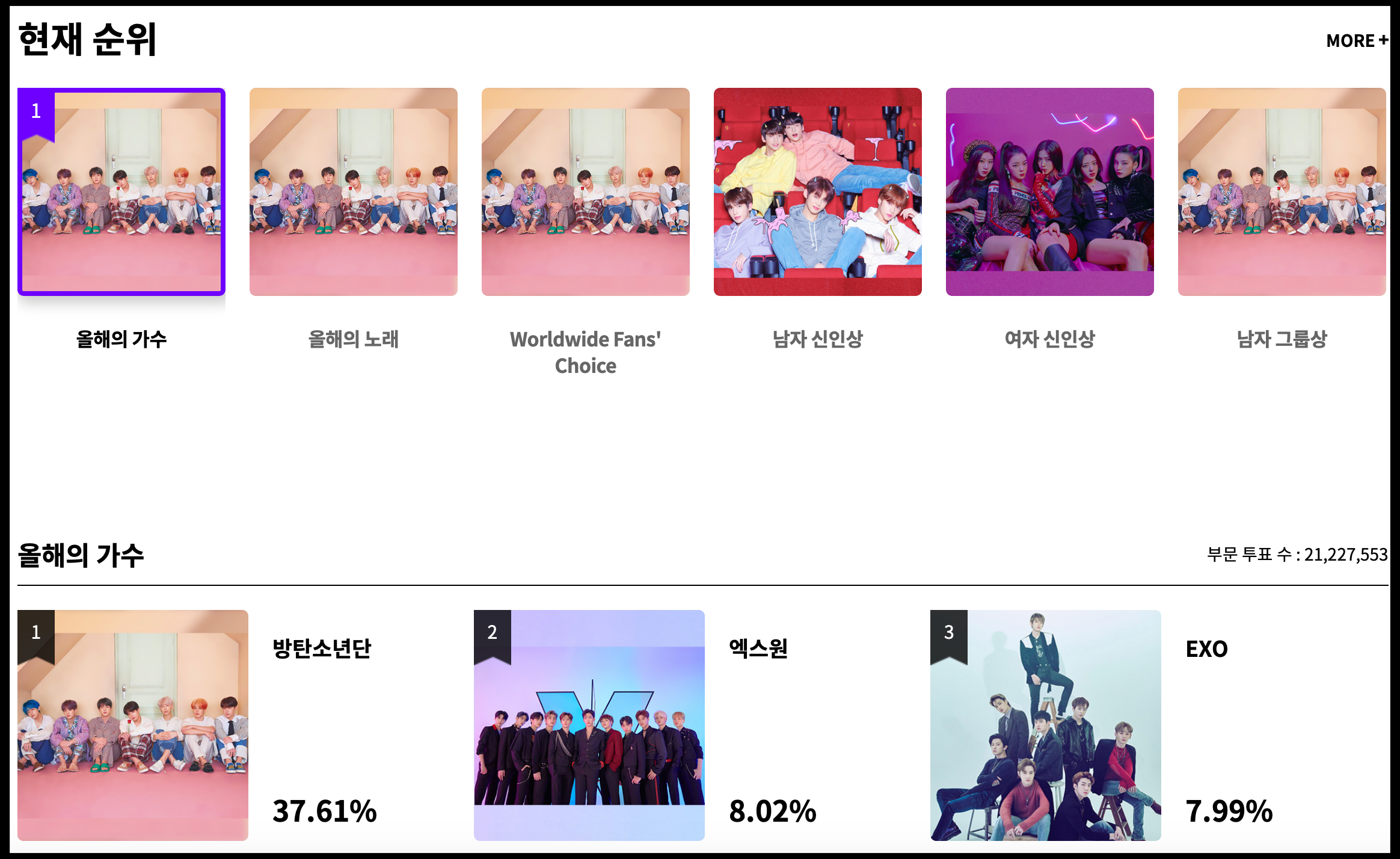 [사진 = 2019 마마 현재까지 득표 현황 이렇습니다. 방탄소년단이 올해의 가수상, 올해의 노래상, Worldwide Fans' Choice, 남자 그룹상, 베스트 댄스 퍼포먼스 남자 그룹 1위에 이름을 올렸습니다. 특히 올해의 가수상 부문은 37.61%로 1위를 기록중이며 2위 엑스원(X1) 8.02%보다 거의 30% 더 많은 득표를 기록했습니다. 올해의 노래상 부문의 경우 방탄소년단이 지금까지 마마에서 대상을 수상한 적이 없습니다. '작은 것들을 위한 시'가 세계적인 대히트를 했다는 점에서 마마 올해의 노래상을 수상할지 기대됩니다. (C) 마마 공식 홈페이지(mama.mwave.me)]
