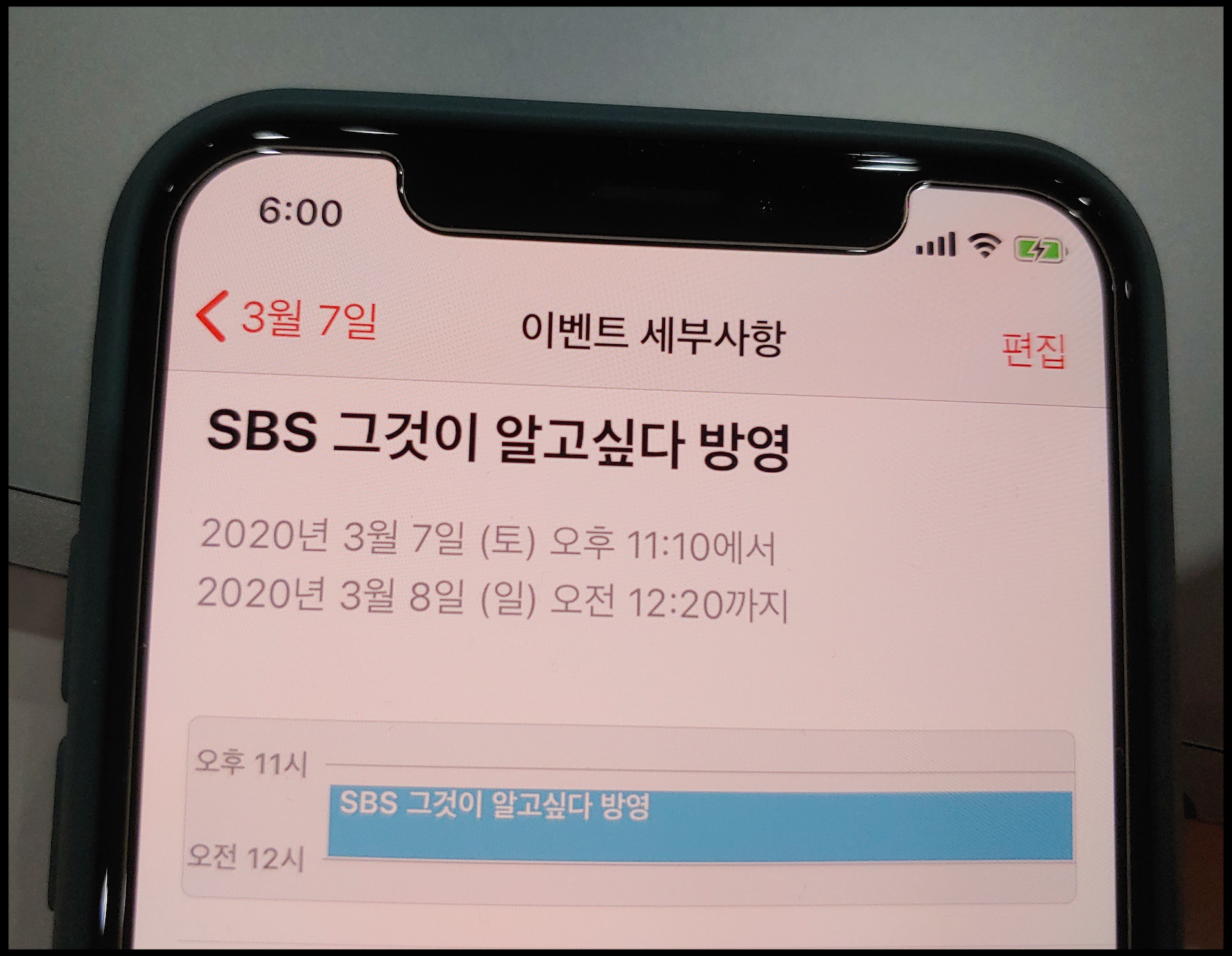 [사진 = 2020년 3월 7일 SBS 그것이 알고싶다 방영됩니다. 사진은 저의 스마트폰 달력이며 2020년 3월 7일 방영됩니다. (C) 나이스블루]