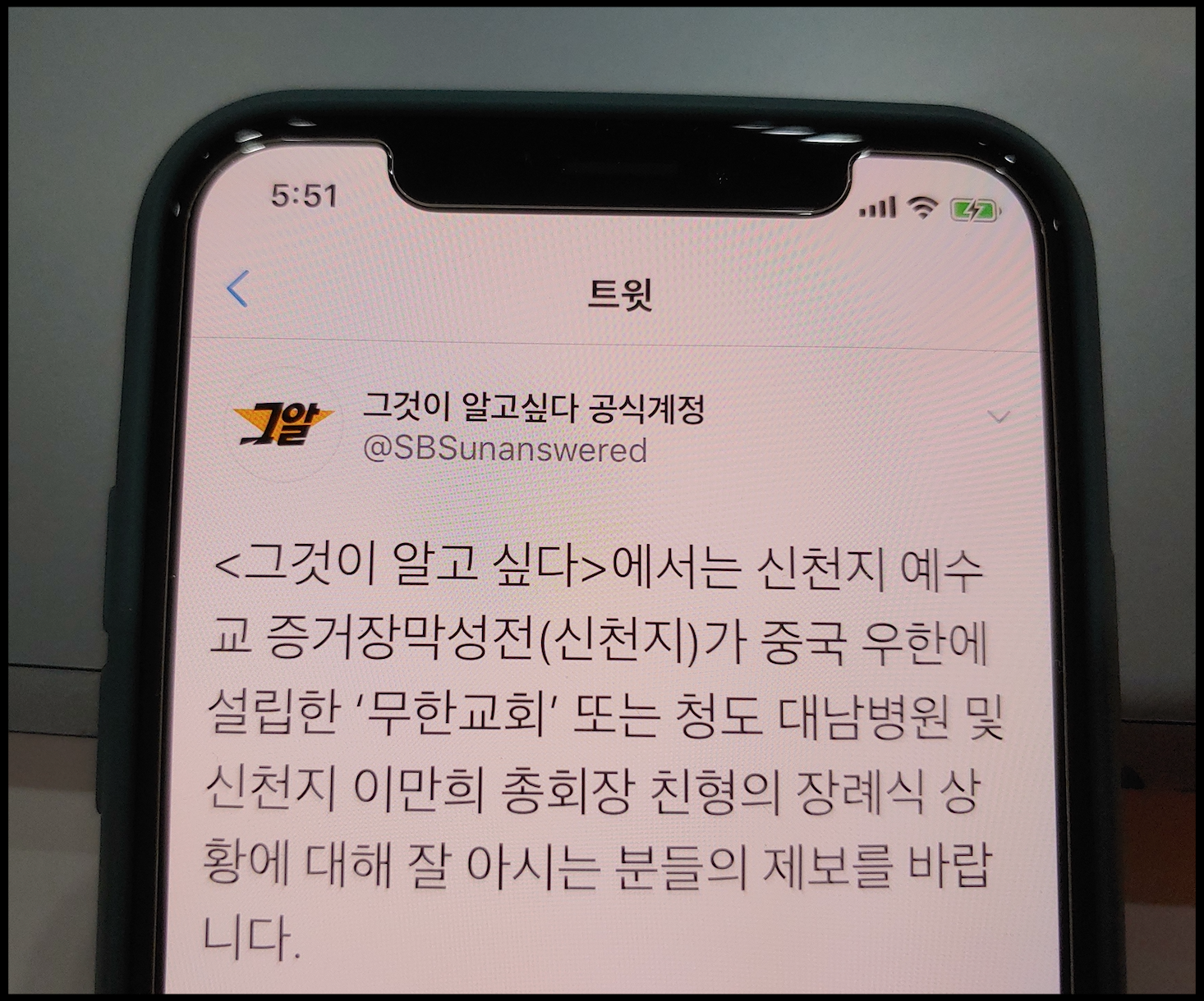[사진 = SBS 그것이 알고싶다 신천지 관련 제보를 받고 있다고 합니다. 신천지가 중국 우한에 설립했던 무한교회 또는 청도 대남병원, 그리고 이만희 신천지 총회장 친형 장례식 상황 관련 제보라고 합니다. (C) SBS 그것이 알고싶다 공식 트위터]