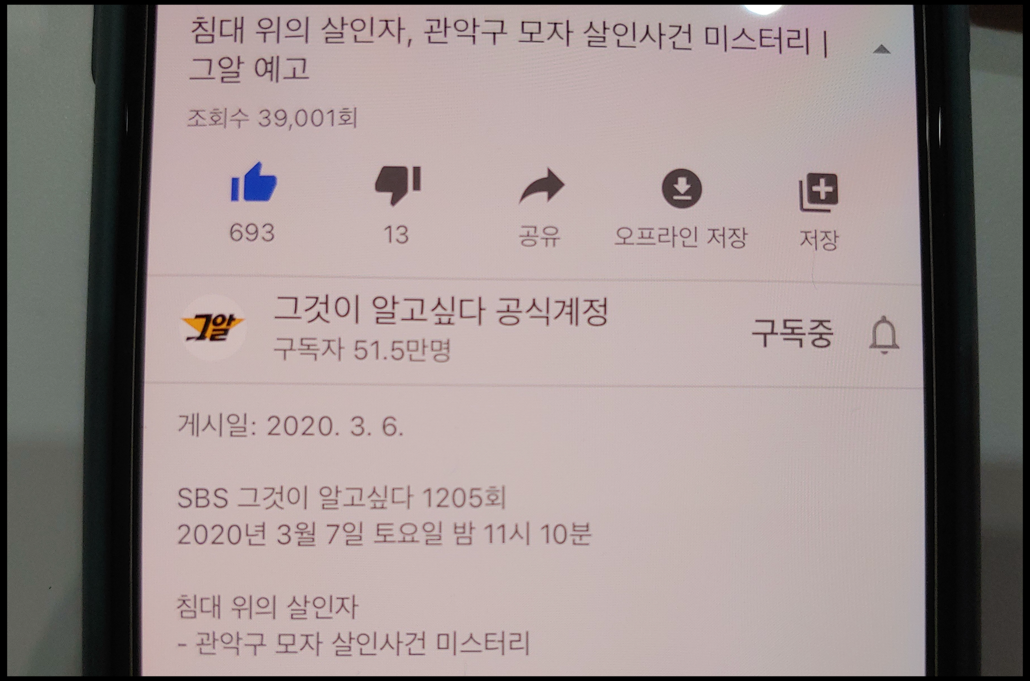 [사진 = SBS 그것이 알고싶다 공식 유튜브에서는 3월 7일 방영 예정인 관악구 모자 살인사건 예고하는 게시물을 올렸습니다. 2월 29일 전옥분 살인사건 방영분 끝나고 예고 영상이 나왔는데 3월 6일 유튜브에서 공개됐습니다. 최근 그것이 알고싶다 공식 유튜브에서 다양한 콘텐츠 동영상 올리며 사람들의 관심을 받고 있습니다. 해당 프로그램 시청하는 사람이 꾸준히 많았다는 점에서 관악구 모자 살인사건 방송을 통해 눈여겨보는 시청자들이 꽤 있을 것입니다. (C) SBS 그것이 알고싶다 공식 유튜브]