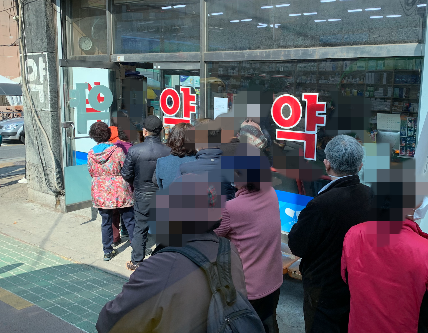 [사진 = 최근 한국의 어느 약국에서 마스크 구입을 위해 줄을 서는 모습을 볼 수 있었습니다. 이곳 뿐만 아니라 다른 약국들도 줄을 서서 기다렸습니다. 약국 마스크 구입 때문입니다. 평소에는 어느 약국이든 줄을 서는 풍경을 보기 어려웠을 겁니다. 주로 전국적으로 유명 맛집에서나 볼 수 있는 모습이었으니 말입니다. 이제는 약국 앞에서 마스크 구입을 위해 대기하는 사람이 늘어선 풍경을 보게 됩니다. (C) 나이스블루]