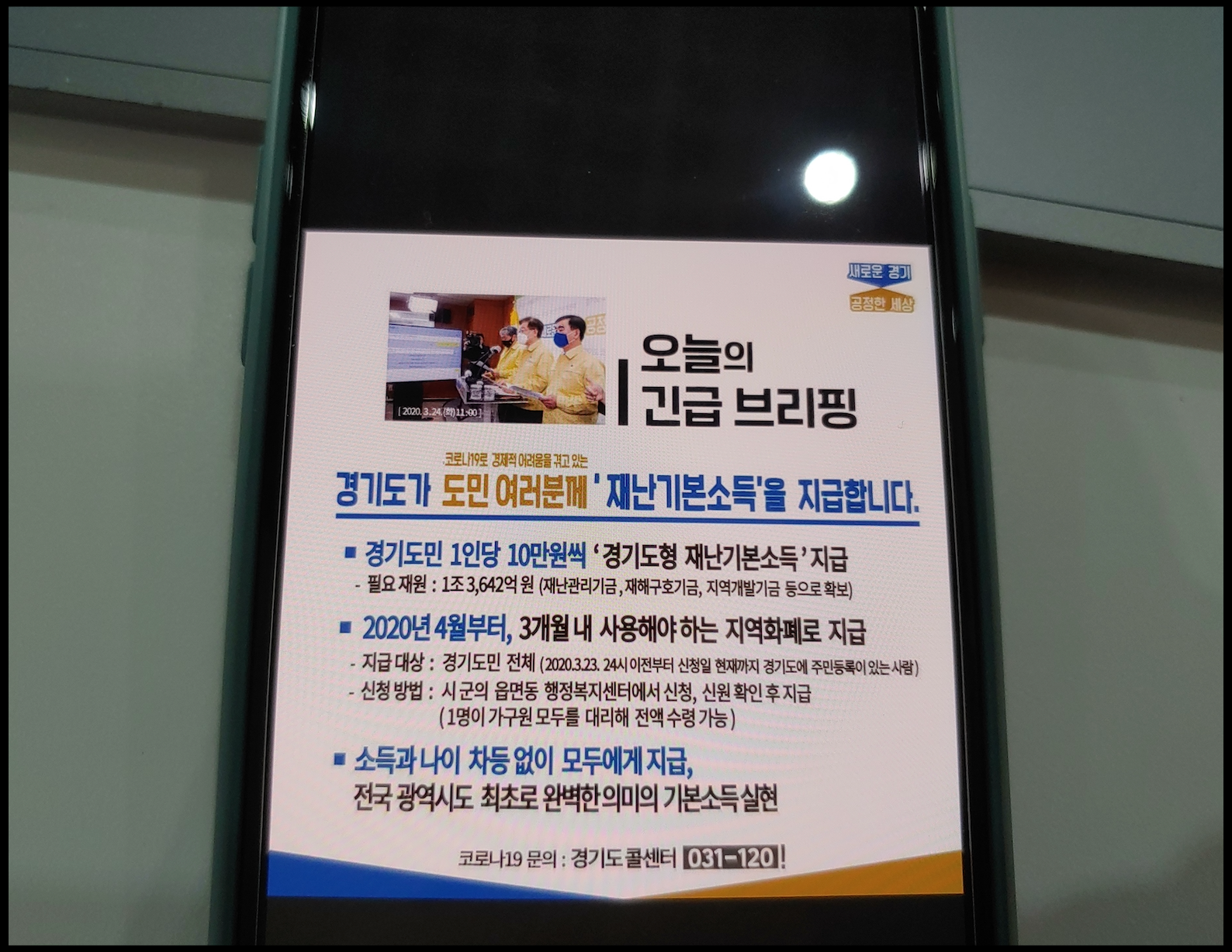 [사진 = 경기도청 공식 페이스북은 3월 24일 경기도형 재난기본소득 지급에 대한 브리핑을 전했습니다. 경기도는 도민들에게 1인당 10만원씩 지급한다고 밝혔습니다. 경기도 재난기본소득 3개월 내에 사용해야 하는 지역화폐 형태로 지급 예정입니다. 이 화폐는 경기도민 전체 받을 수 있으나 외국인은 지원하지 않습니다. 경기도 재난기본소득 신청하려면 2020년 4월부터 행정복지센터에서 신청하시면 된다고 합니다. 경기도청 페이스북 게시물에서 강조하는 부분은 재난기본소득 지급이 소득 및 나이 차등없이 지급된다는 점입니다. 평등하게 지급한다는 것을 알렸습니다. (C) 경기도청 공식 페이스북]