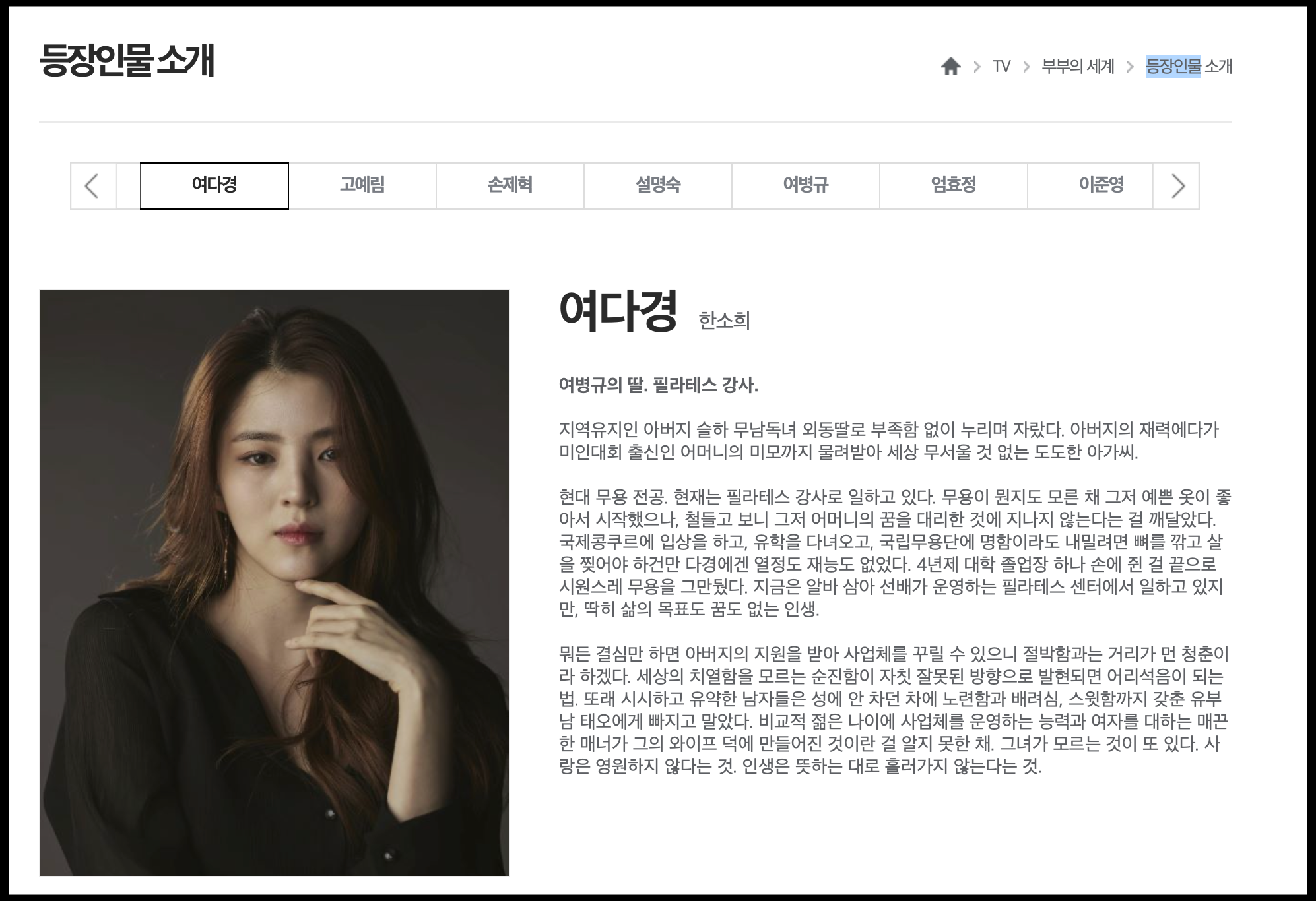 [사진 = 한소희는 JTBC 금토 드라마 부부의 세계 여다경 역으로 출연중입니다. 극중에서는 여병규(이경영)의 딸이자 필라테스 강사로 나옵니다. 지난 1~2회 만을 놓고 보면 이태오(박해준) 사이에서 지선우(김희애)와 묘한 대립을 하는 관계로 나왔습니다. 향후 이 드라마가 어떻게 전개될지 알 수 없으나 김희애와의 대립이 계속될지 아니면 누구도 예상 못한 시나리오가 나타날지 주목됩니다. 부부의 세계는 1~2회에서 많은 것이 드러난 드라마였던 것 같습니다. (C) JTBC 부부의 세계 공식 홈페이지 프로필 사진]