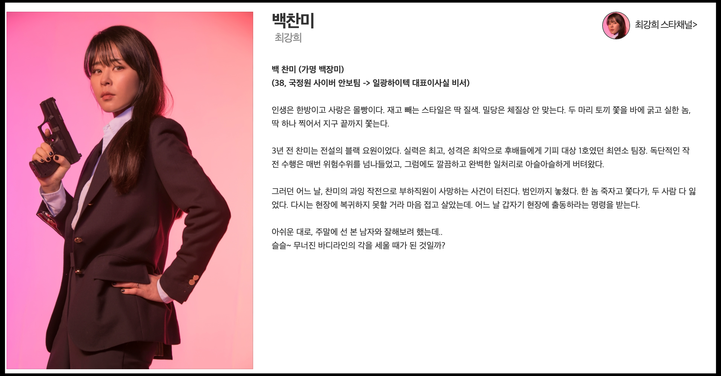현재 SBS에서 방영중이자 곧 종영을 앞둔 아무도 모른다에서는 주인공 김서형 드라마 속 캐릭터가 걸 크러시한 느낌을 자아냅니다. 다르게 표현하면 강인한 모습을 보여줬습니다. 아무도 모른다 후속작 굿캐스팅에서는 어쩌면 걸 크러시의 다른 느낌을 볼 수 있지 않을까 싶은 기대감이 듭니다. 아직 이 드라마가 방영되지 않았으나 지금까지 공개된 티저만을 놓고 보면 강한 매력을 보여줄 것 같은 아우라가 느껴졌습니다. 최강희 나이 및 그동안 수많은 작품에 출연했던 경험을 떠올리면 굿캐스팅에서 자신의 매력을 생생하게 보여줄 것 같아 보입니다.