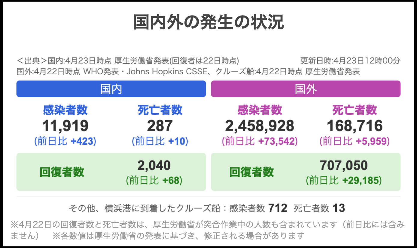 [사진 = 일본 코로나 확진자 4월 23일 12시 기준으로 크루즈 제외 시 11,919명이며 사망자 287명입니다. 참고로 한국은 확진자 10,702명이며 사망자 240명입니다. 아울러 일본에서 확진자가 많은 곳은 도쿄도이며 3,320명입니다. 그 다음으로 오사카부 1,351명, 카나가와현 816명, 치바현 704명, 사이타마현 816명, 효고현 546명, 후쿠오카현 539명으로 나타났습닏. 주로 관동 지방쪽에서 확진자가 많습니다. (C) 야후재팬 공식 홈페이지(yahoo.co.jp)]