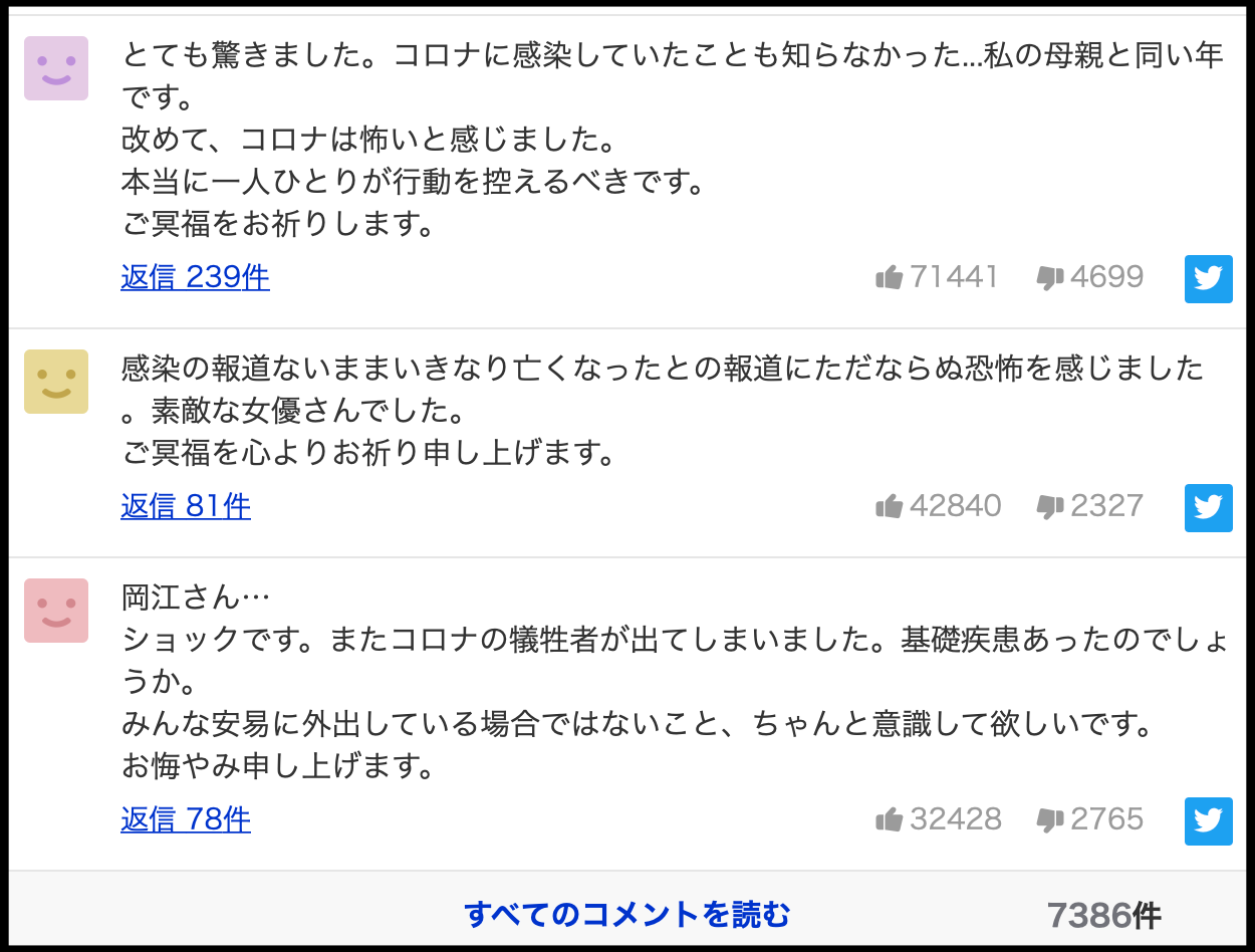 -오카에씨. 쇼크입니다. 또 코로나에 희생자가 발생해 버렸습니다. 기초질환이 있었던 걸까요? 모두 안이하게 외출하고 있을 때가 아니라는 점, 제대로 의식했으면 합니다. 조의를 표합니다.