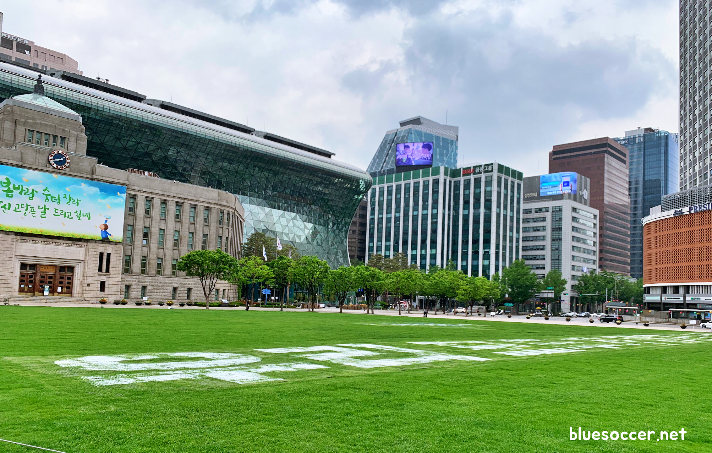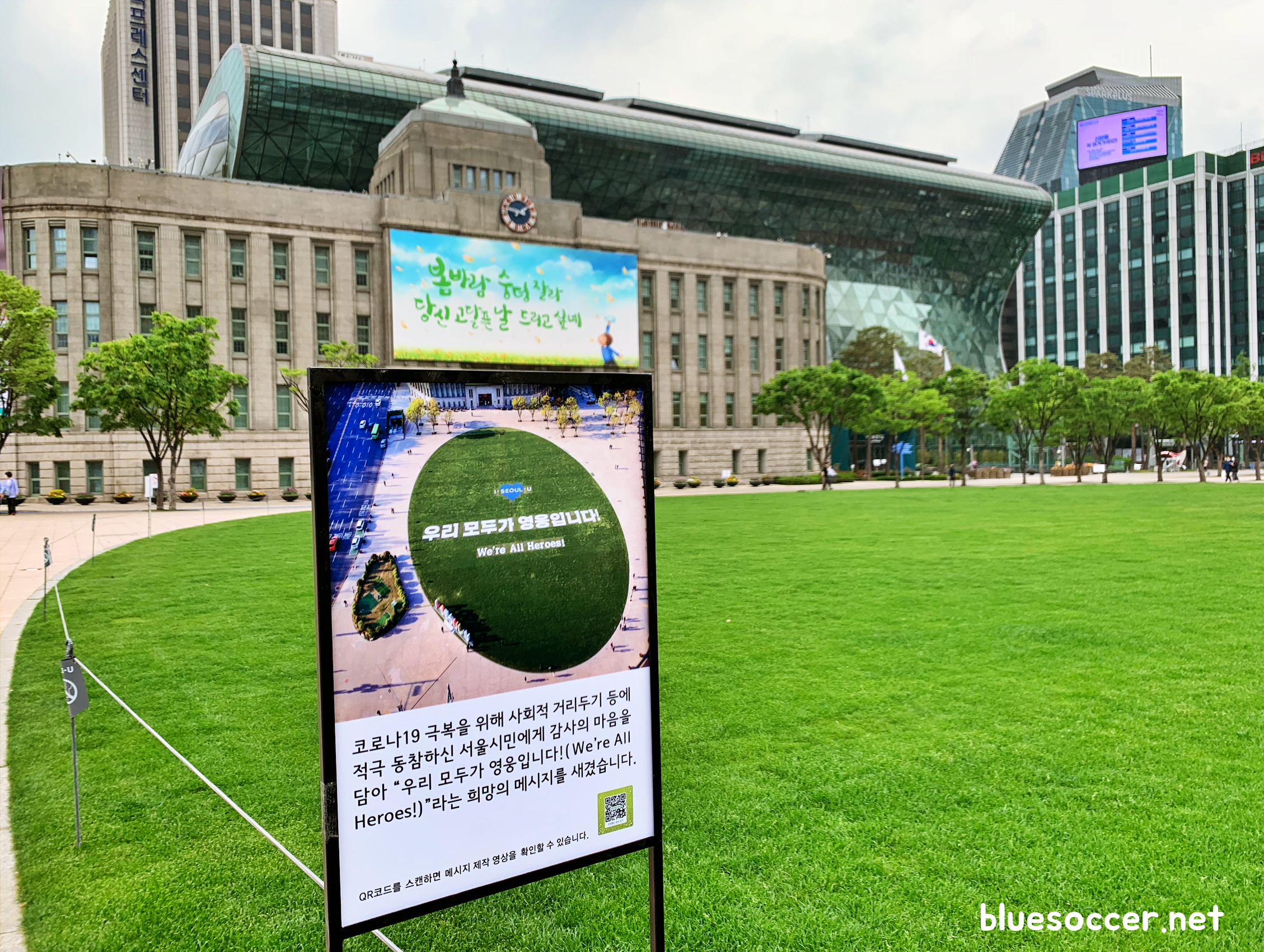 저 같은 경우에는 잔디밭 바로 옆에서 메시지가 새겨진 모습을 봤습니다. 비록 메시지 전체 모습을 사진에 모두 담을 수 없었으나 이전과 달라진 서울광장의 풍경을 확인했습니다. 서울광장에서 서울시민에 대한 감사의 표현이 시각화된 것은 뜻깊은 일입니다.