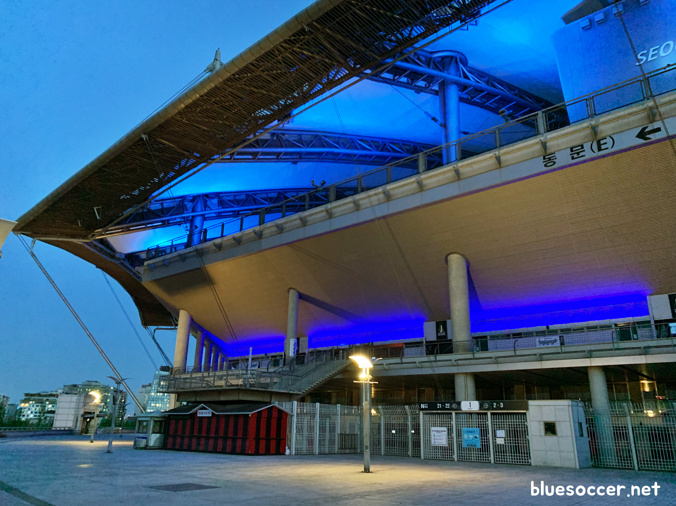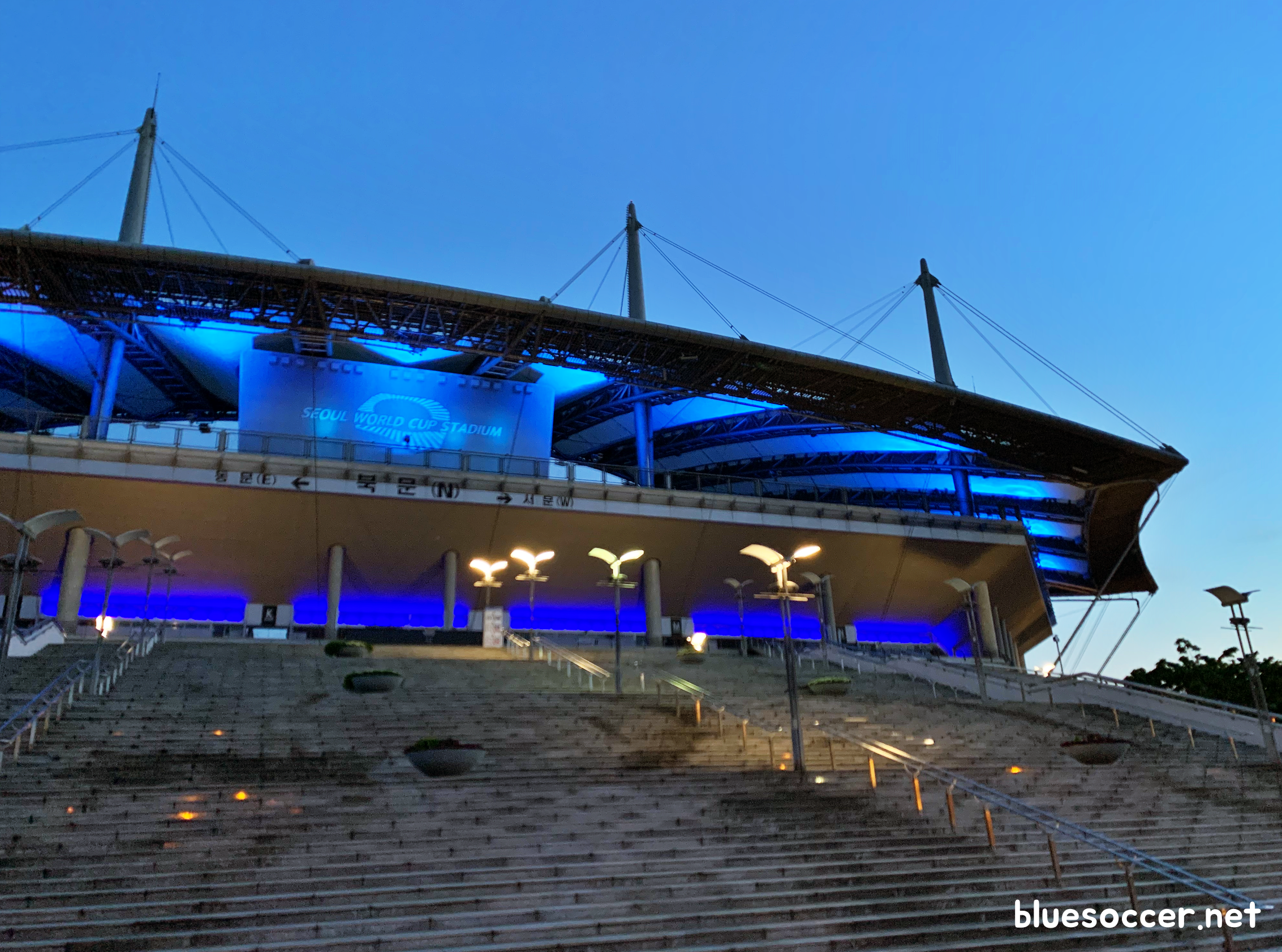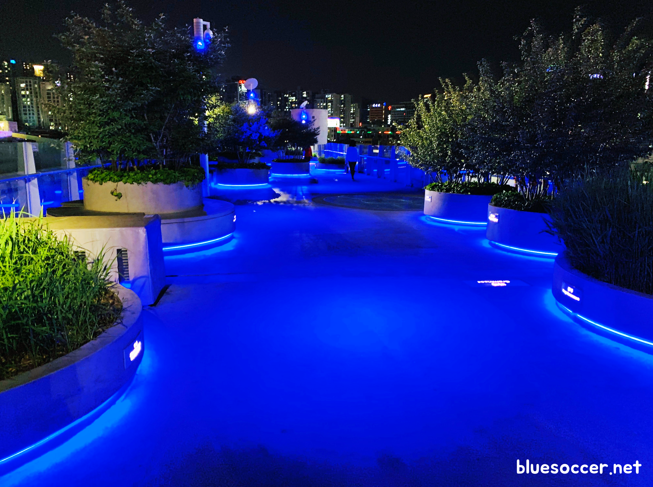 다음 날에는 서울월드컵경기장으로 향했습니다. 이곳에서도 블루라이트 캠페인 진행된 모습을 볼 수 있습니다. 경기장 지붕에 파란색이 들어온 모습이 개인적으로는 낯설게 느껴졌습니다. 저에게 있어서 서울월드컵경기장하면 떠올리게 되는 색깔이 붉은색입니다. 서울월드컵경기장은 축구 A매치가 펼쳐지는 곳으로서 한국 대표팀 선수들의 홈 유니폼 상의는 붉은색입니다. 또한 이곳은 K리그 FC서울 홈 구장입니다. FC서울 선수들이 서울월드컵경기장에서 경기에 임할 때의 홈 유니폼 상의는 검붉은색(검정+붉은색)입니다. 그렇기에 서울월드컵경기장하면 붉은색을 떠올리기 쉬운데 지붕에 푸른빛이 들어왔습니다. 평소에 볼 수 없었던 모습을 블루라이트 캠페인 통해서 직접 접했습니다.