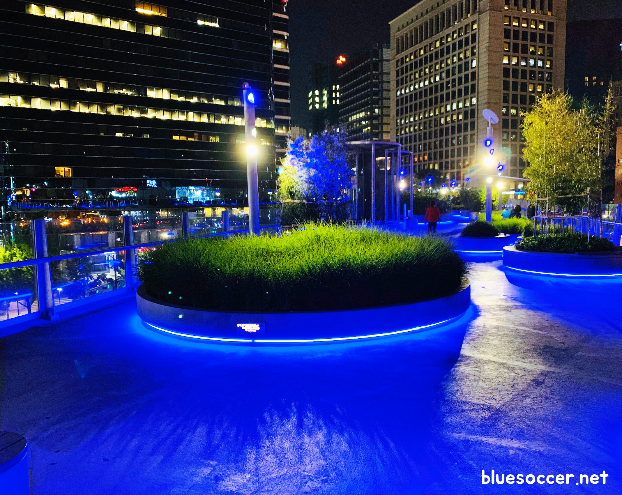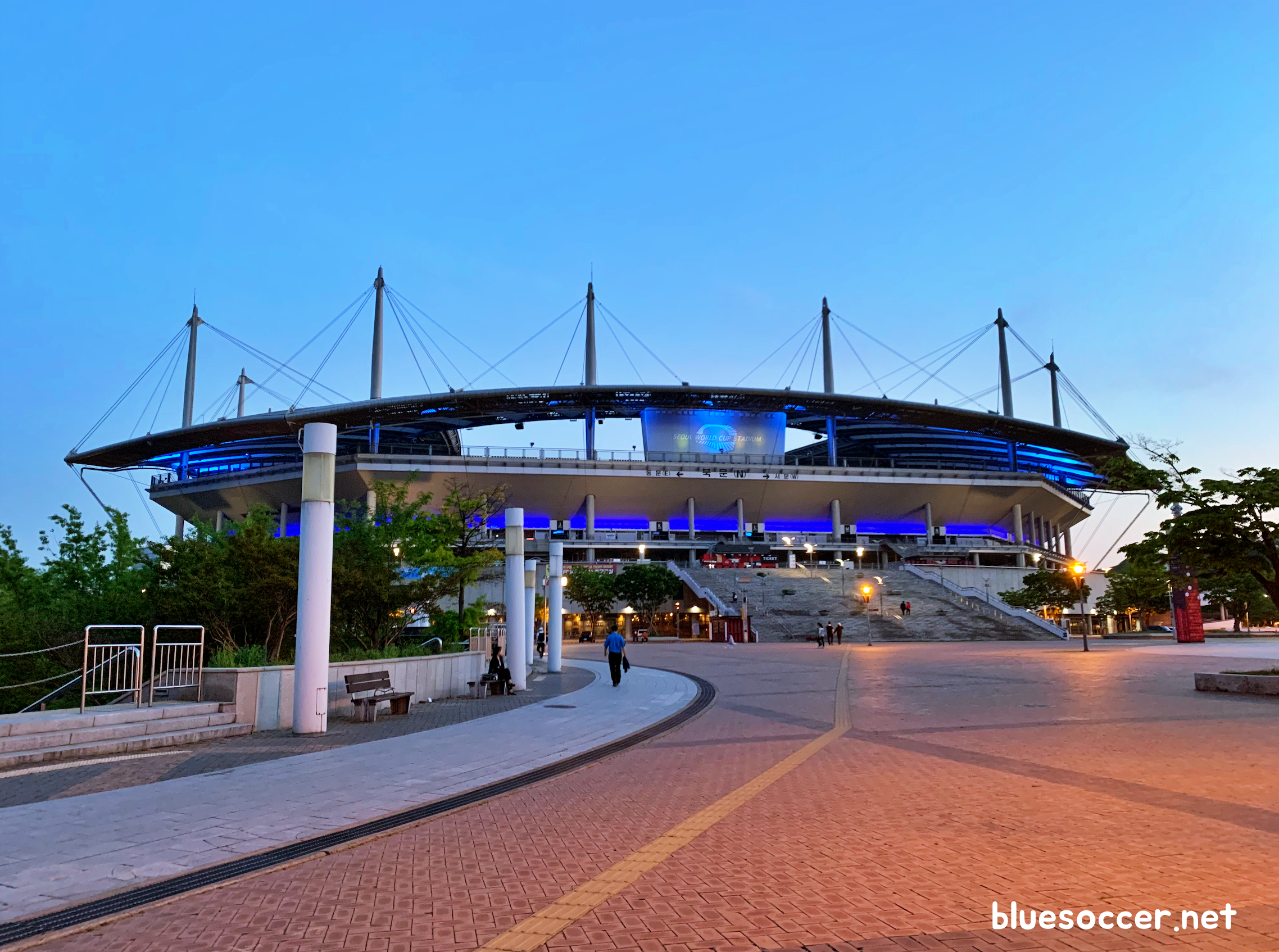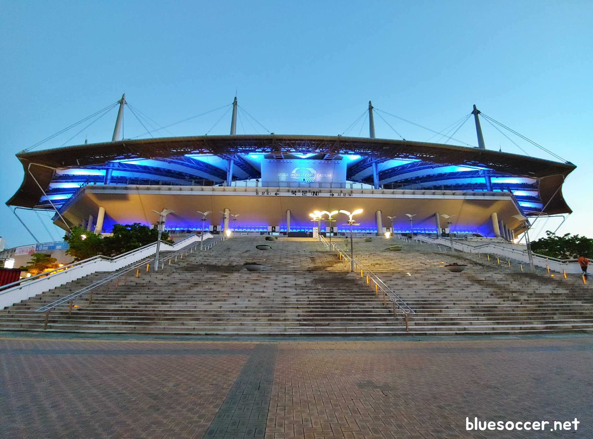 다음 날에는 서울월드컵경기장으로 향했습니다. 이곳에서도 블루라이트 캠페인 진행된 모습을 볼 수 있습니다. 경기장 지붕에 파란색이 들어온 모습이 개인적으로는 낯설게 느껴졌습니다. 저에게 있어서 서울월드컵경기장하면 떠올리게 되는 색깔이 붉은색입니다. 서울월드컵경기장은 축구 A매치가 펼쳐지는 곳으로서 한국 대표팀 선수들의 홈 유니폼 상의는 붉은색입니다. 또한 이곳은 K리그 FC서울 홈 구장입니다. FC서울 선수들이 서울월드컵경기장에서 경기에 임할 때의 홈 유니폼 상의는 검붉은색(검정+붉은색)입니다. 그렇기에 서울월드컵경기장하면 붉은색을 떠올리기 쉬운데 지붕에 푸른빛이 들어왔습니다. 평소에 볼 수 없었던 모습을 블루라이트 캠페인 통해서 직접 접했습니다.