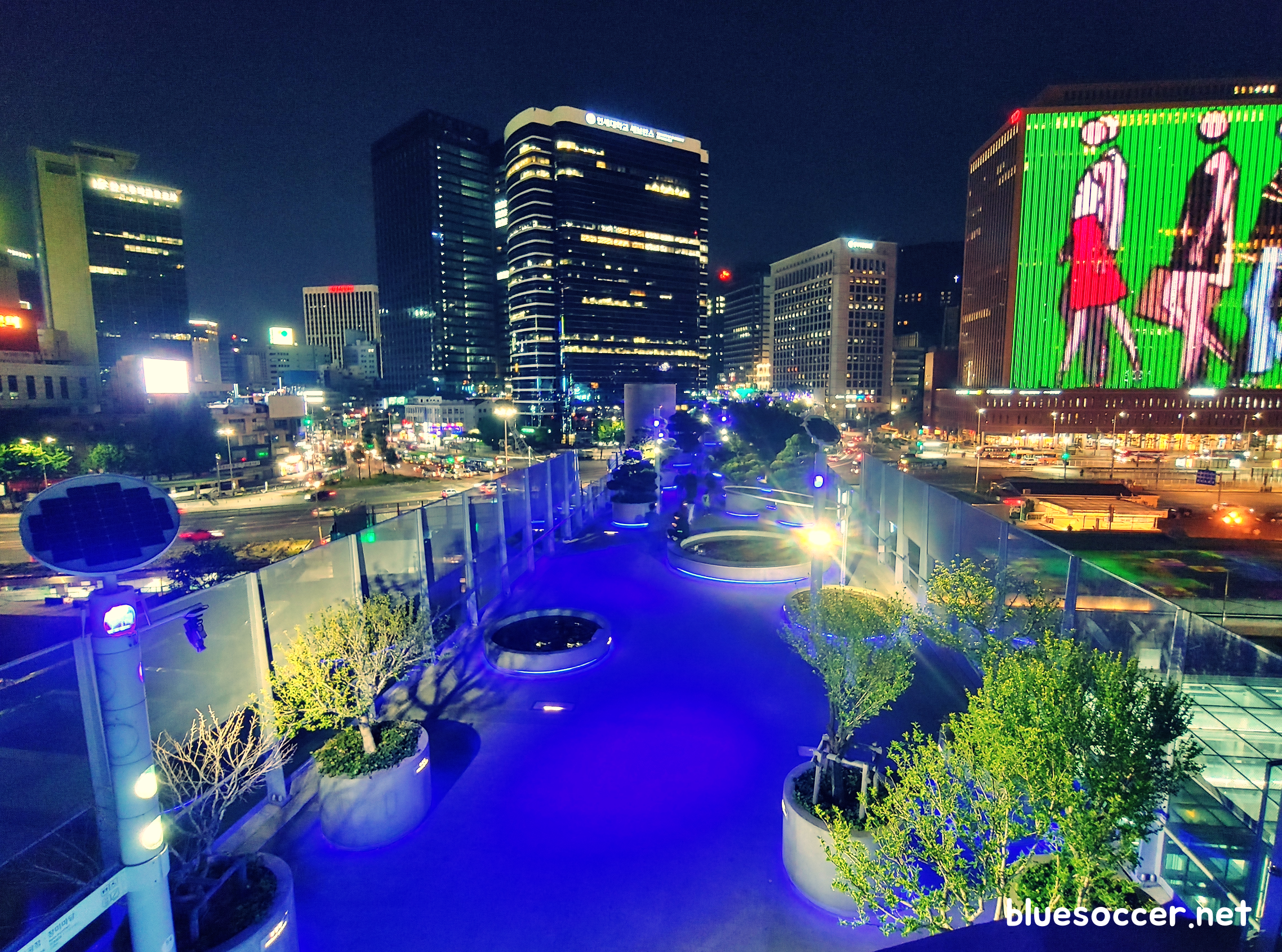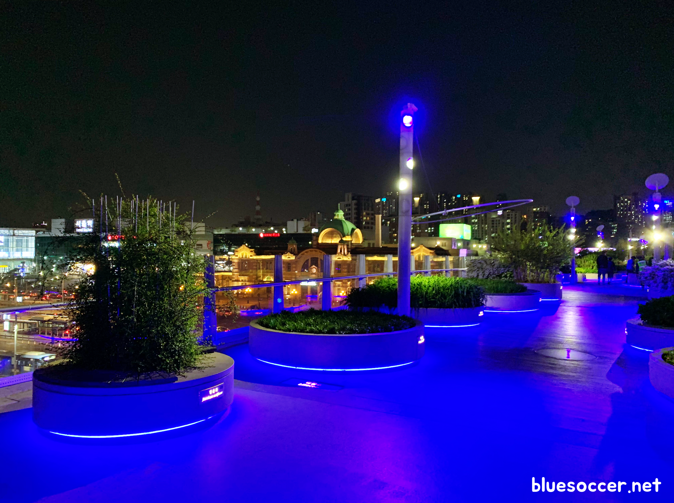 이번에 찾은 곳은 서울역과 가까이에 있는 서울로 7017입니다. 서울시청 인근에 있는 곳이라 이곳도 들리게 됐습니다. 서울로 7017은 서울 도심에서 낭만적인 사진을 촬영하고 싶어하는 사람이 찾을만한 곳이자 커플 및 해외 관광객 등이 주로 찾는 명소입니다. 사람이 지나다니는 곳에 푸른빛 조명이 비추고 있었습니다.