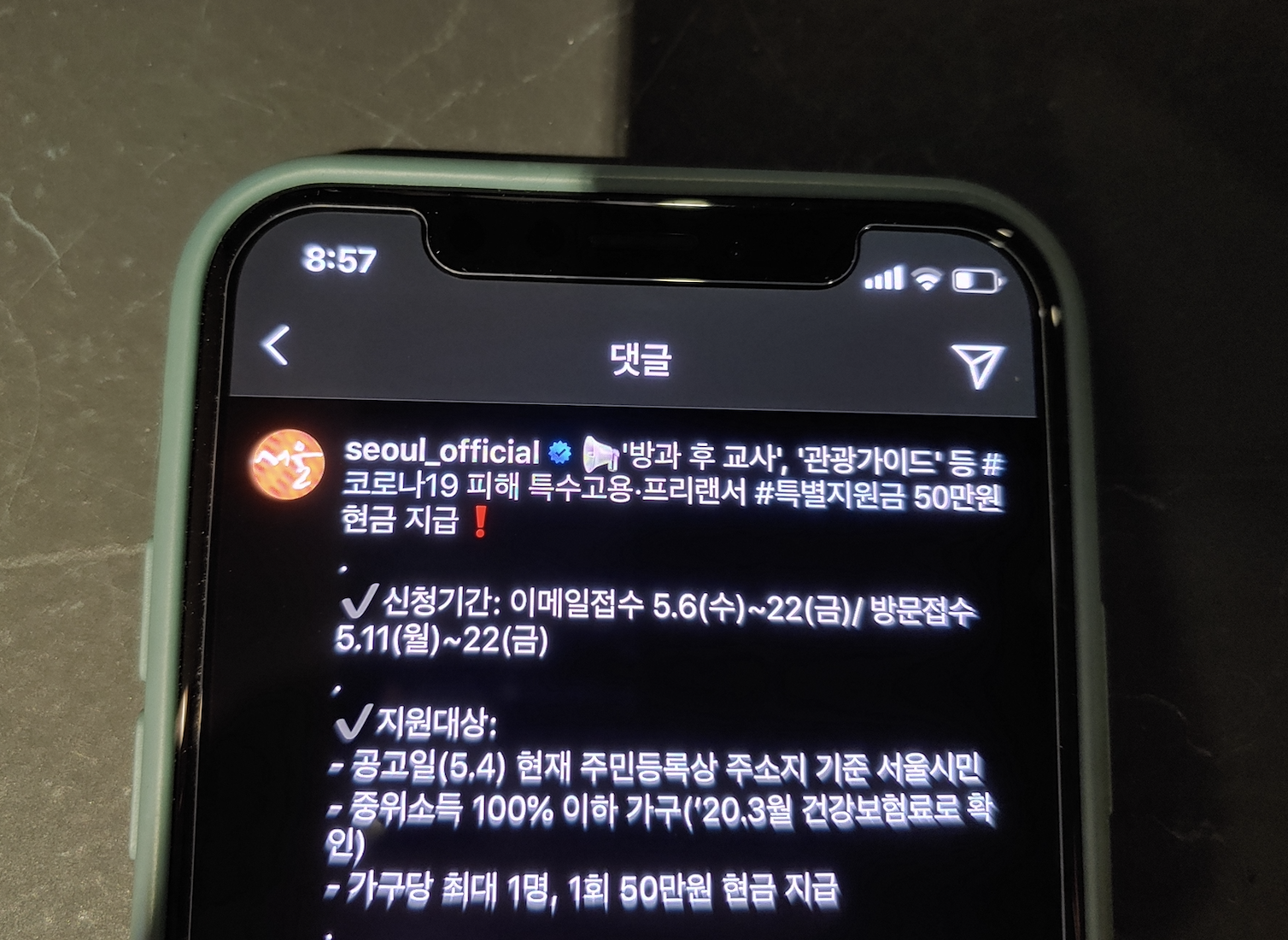[사진 = 서울시 공식 인스타그램에서는 방과 후 교사, 관광가이드 등으로 활동중인 프리랜서와 관련하여 특별지원금 50만원 현금 지급 관련 게시물을 올렸습니다. 서울시 프리랜서 지원금 신청 기간은 이메일 접수 시 5월 6일 수요일부터 5월 22일 금요일까지이며 방문접수는 5월 11일 월요일부터 5월 22일 금요일까지입니다.(시간은 22일 오후 5시까지) 방문접수 할 수 있는 곳은 신청하는 분 주민등록상 주소지 관할 구청의 일자리 관련 부서입니다. 예를 들어 동작구에 주소지를 둔 분이라면 동작구청 일자리플러스센터 2층을 찾으시면 됩니다. (C) 서울시 공식 인스타그램]