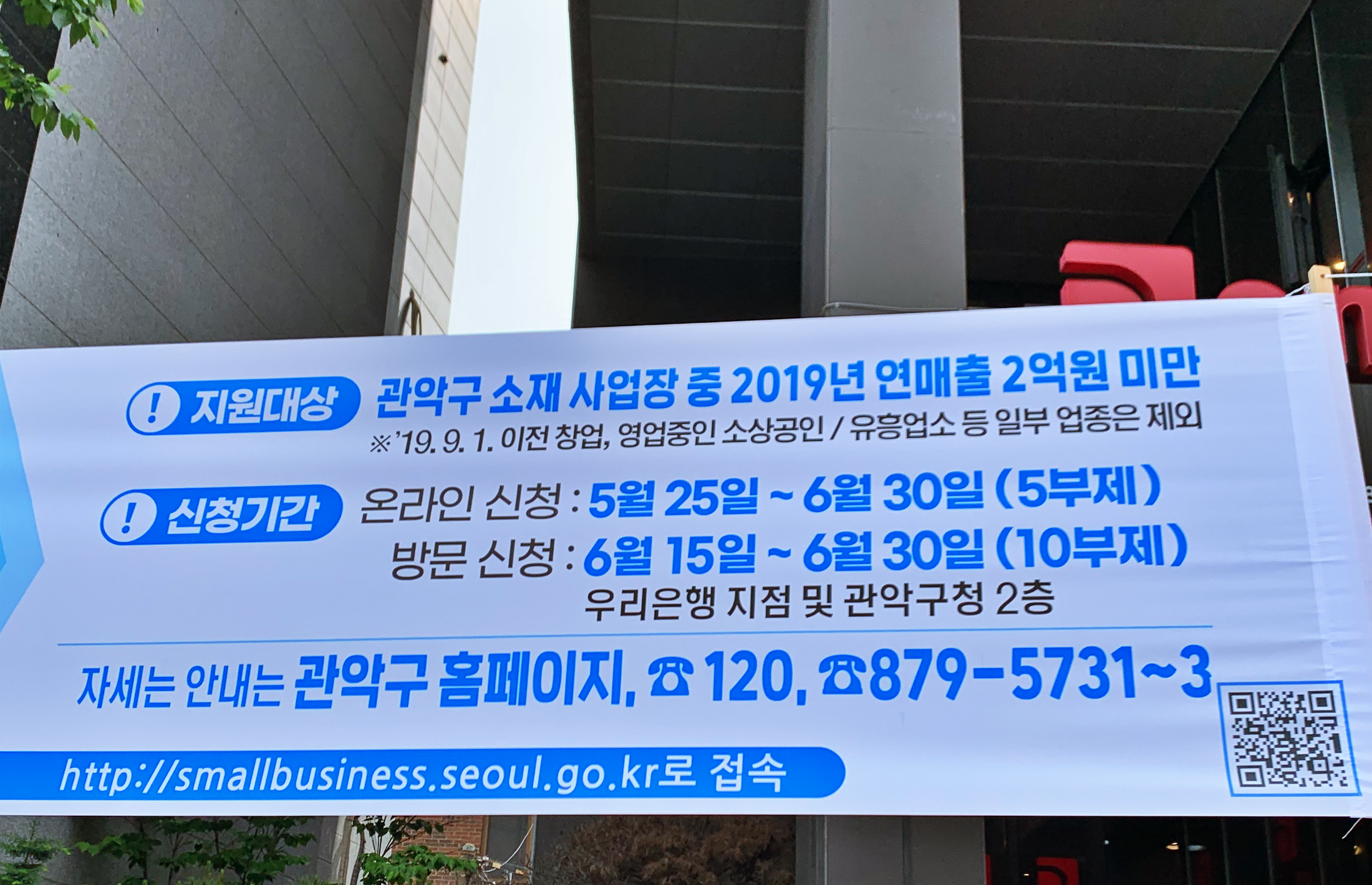[사진 = 현수막을 보니 서울시 자영업자 생존자금 지원 대상은 2019년 연매출 2억원 미만입니다. 지난해 9월 1일 이전 창업, 영업중인 소상공인이 해당됩니다. 관악구 뿐만 아니라 서울시 모든 자치구가 해당됩니다. 반면 서울시 자영업자 140만원 제한업종 있음을 알 수 있습니다. 온라인 신청과 방문 신청 기간이 다르다는 점을 파악할 수 있으며, 각각 5부제와 10부제 형태로 신청하시면 됩니다. 관악구 같은 경우 서울시 자영업자 생존자금 우리은행 지점 및 관악구청 2층에서 신청할 수 있는데 이러한 방문 신청은 6월 15일부터 6월 30일까지 할 수 있으며 10부제 신청 날짜를 꼭 파악하셔서 자신이 해당되는 날에 신청하시면 됩니다. (C) 나이스블루]