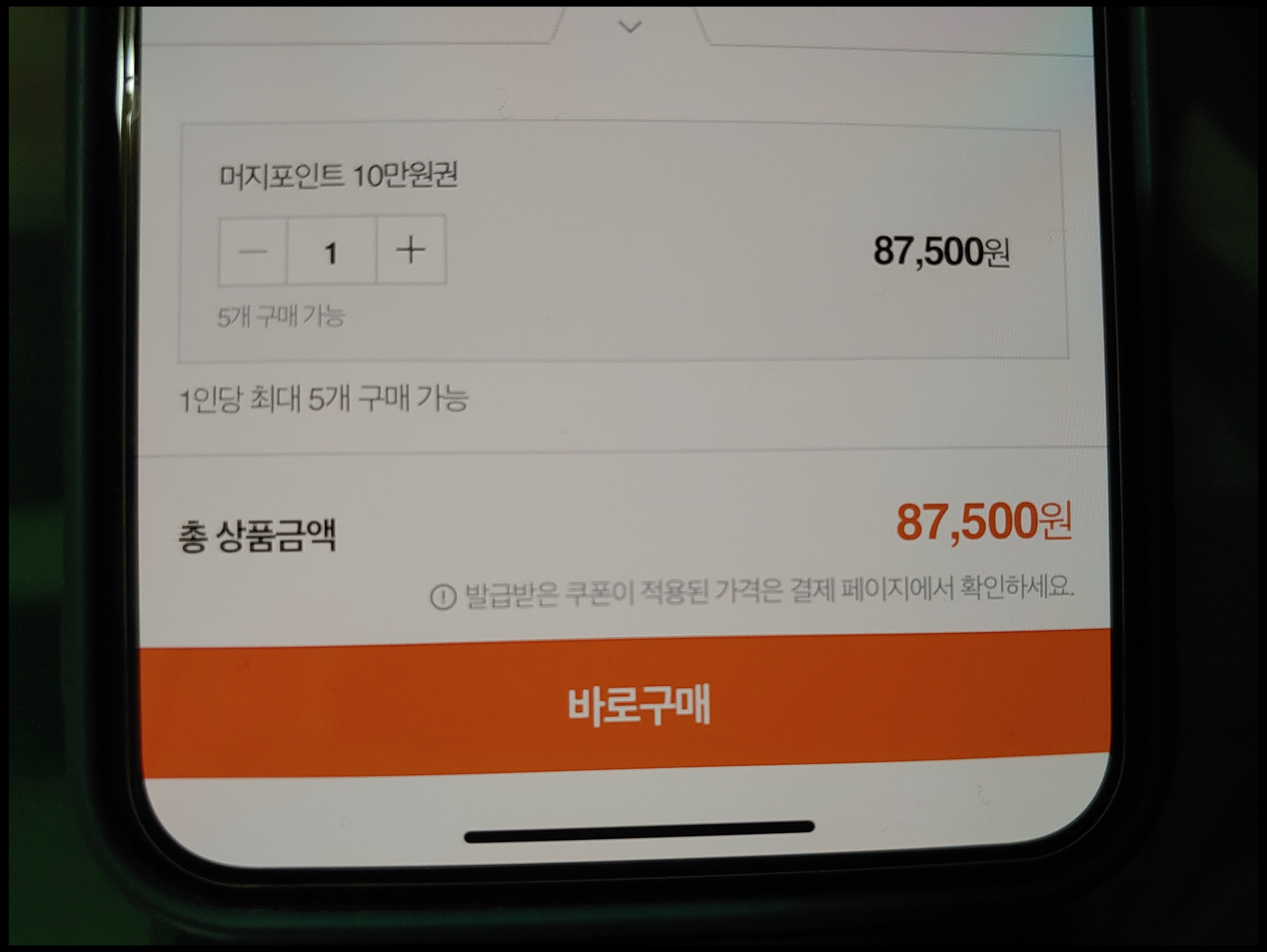 현재 티몬에서는 머지포인트 10만원권 1인당 최대 5개 구매 가능합니다. 1개 당 87,500원입니다.(향후 변동 가능성 있음!) 그런데 여기서 중요한 것이 있습니다.