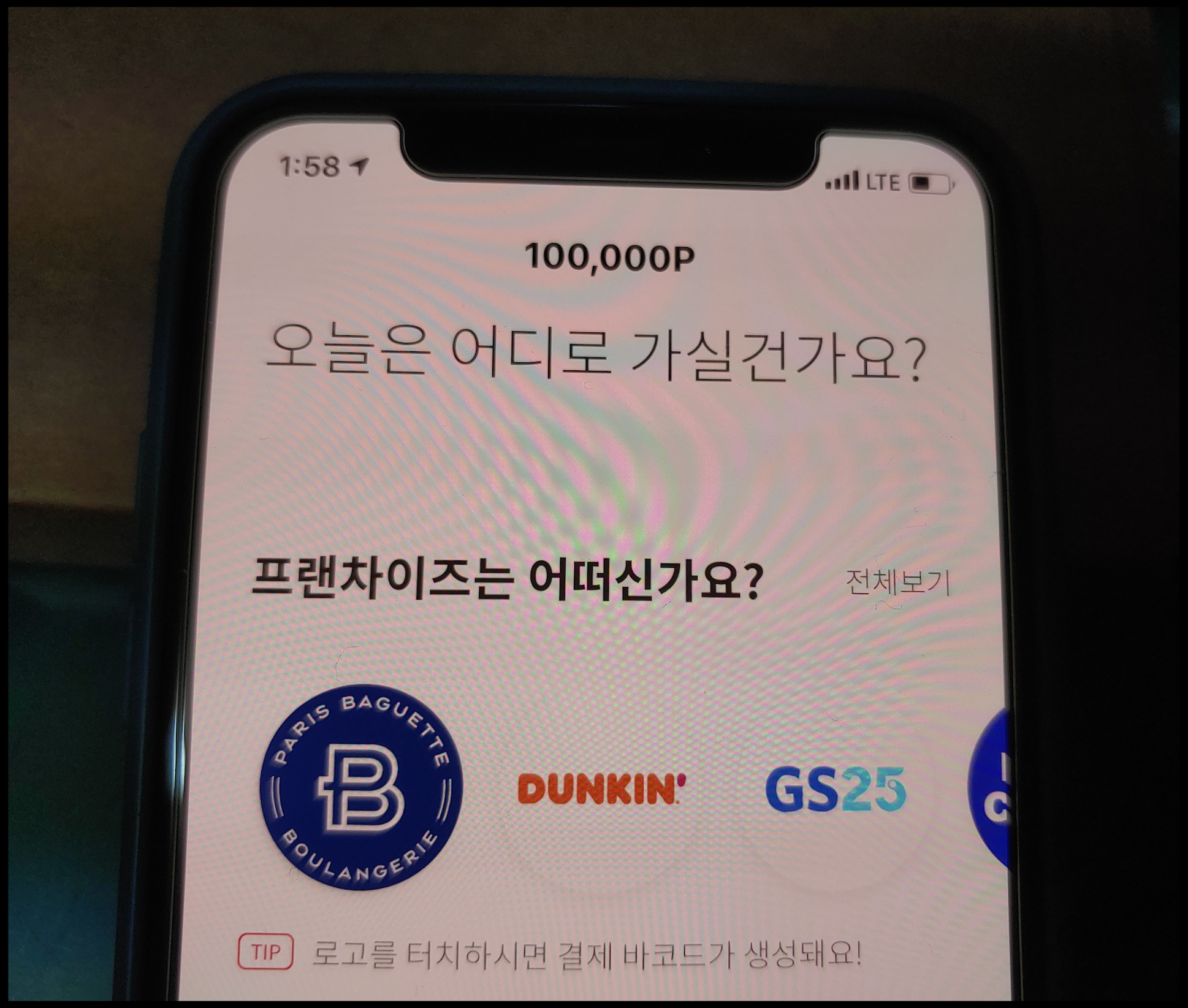 머지포인트 앱 메인에는 여러 사용처들이 뜹니다. 손가락으로 로고 만지면 해당 사용처의 결제 바코드가 생성됩니다.