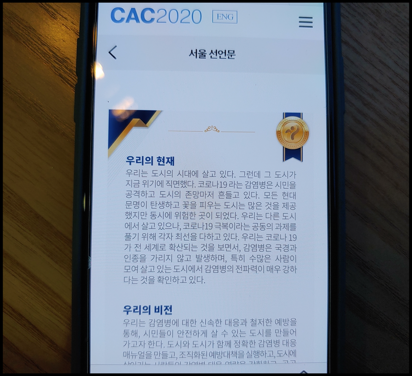지난 6월 2일 CAC 글로벌 서밋 2020 도시정부 시장회의에서는 서울시 포함한 참여 도시들이 서울선언문을 공동 발표했습니다. 우리의 현재, 우리의 비전, 우리의 연대, 도시간 협의체 설립 제안에 대하여 발표하면서 다음 사항들을 강조했습니다.