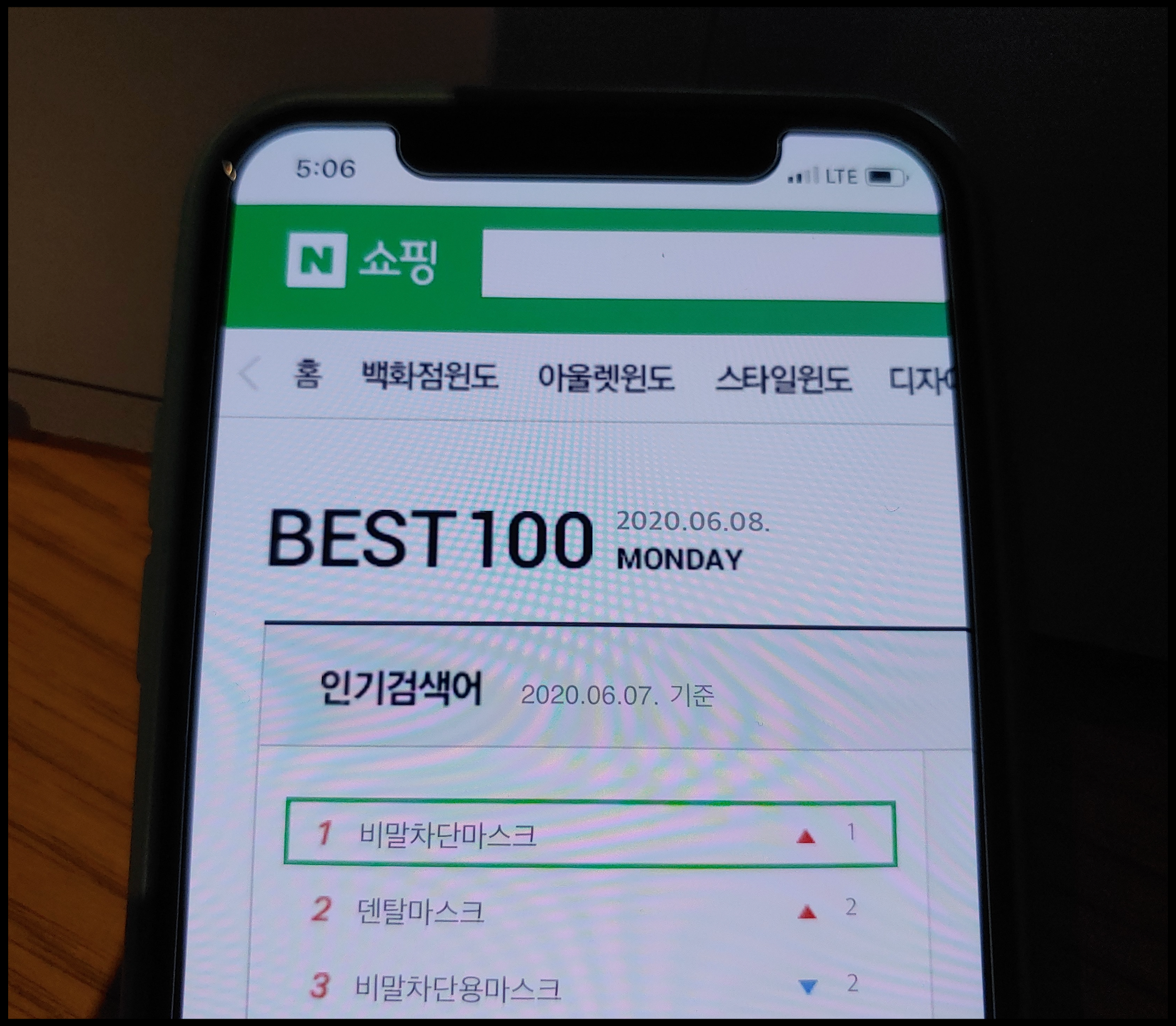 [사진 = 지난 6월 7일 기준으로 네이버쇼핑 인기검색어에는 비말차단마스크, 덴탈마스크, 비말차단용마스크 1~3위 기록했습니다. 네이버쇼핑에서 해당 마스크 구입하려는 사람이 얼마나 많은지 알 수 있습니다. (C) 네이버쇼핑 홈페이지]