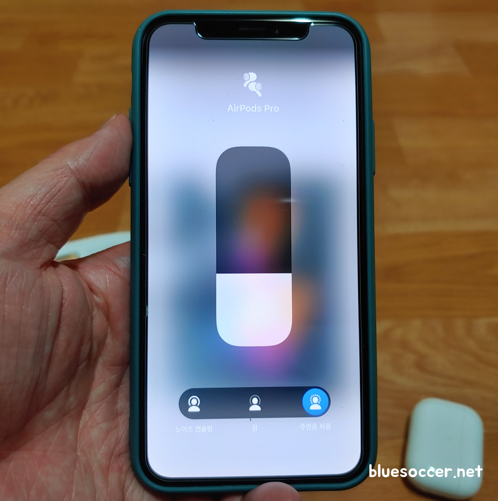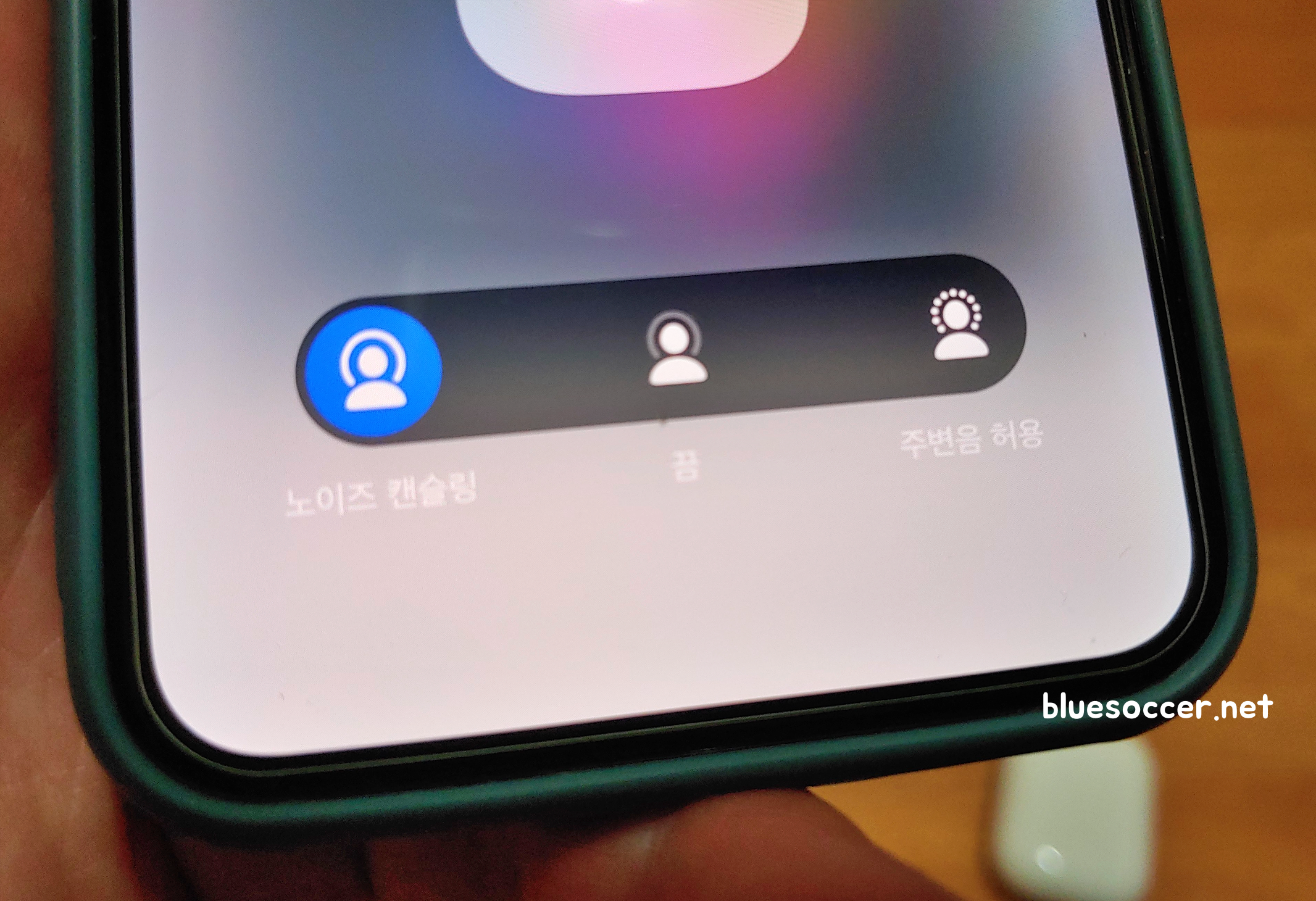 에어팟 프로 사용법 노이즈 캔슬링 적용하려면 이 화면에서 아이폰 하단 왼쪽 노이즈 캔슬링이라는 부분을 누르면 됩니다. 저 같은 경우에는 제품을 처음 이용했을 때 주변음 허용으로 설정되었는데 노이즈 캔슬링으로 설정하시면 됩니다.