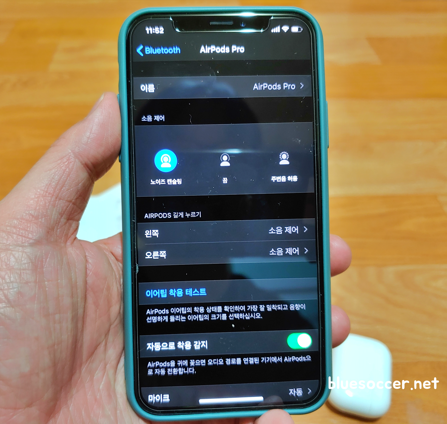 또 다른 방법도 있습니다. 블루투스 메뉴에서 에어팟 프로와 연결된 뒤, 에어팟 프로의 'i'를 누르면 화면이 이렇게 뜹니다. 소음 제어를 통해 노이즈 캔슬링으로 설정하시면 됩니다.