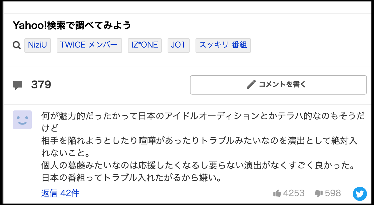 (1) 뭐가 매력적이었냐고 일본 아이돌 오디션이라던가 태라하적인 것도 그렇지만, 상대를 모함하려고 하거나 시비가 붙거나 트러블 같은 것을 연출로 절대 넣지 말 것. 개인 갈등 같은 건 응원하고 싶고 불필요한 연출이 없어서 너무 좋았어. 일본 프로그램은 트러블을 개입시키고 싶어해서 싫어.
