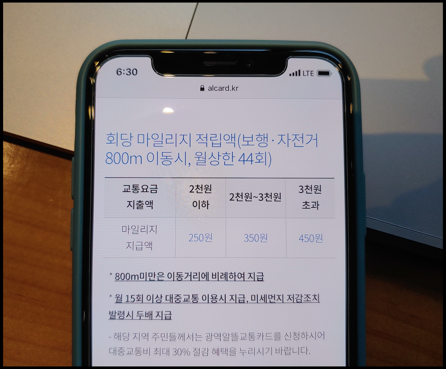 [사진 = 최근 사용지역이 확대된 광역알뜰교통카드 마일리지 적립액은 1회 당 이렇습니다.(보행 및 자전거 800m 이동시, 월상한 44회) 2천 원 이하 250원, 2천~3천 원 350원, 3천 원 초과 450원입니다. 800m 미만은 이동거리 비례해서 지급되며 월 15회 이상 대중교통 이용하면 지급된다고 합니다. 아울러 미세먼지가 매우 심한 날은 미세먼지 저감조치 발령하게 되는데 그럴 때 2배 지급된다고 합니다. (C) 광역알뜰교통카드 홈페이지]