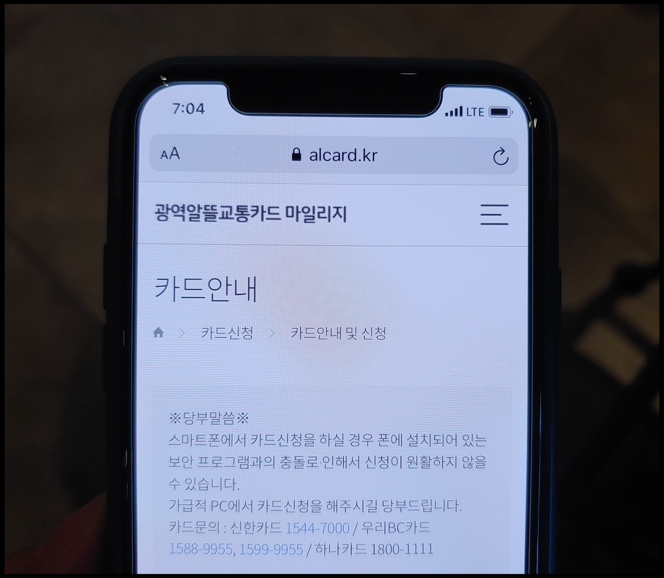 [사진 = 광역알뜰교통카드 신청은 스마트폰이 아닌 가급적 PC에서 진행해야 한다고 합니다. (C) 광역알뜰교통카드 홈페이지 모바일 버전]