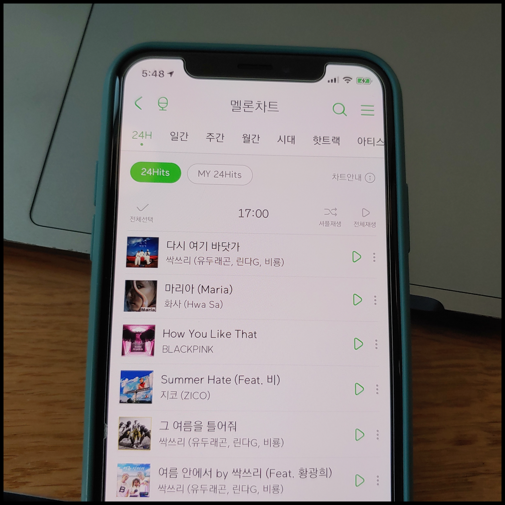 [사진 = 7월 26일 오후 5시 멜론 앱 24Hits에서는 싹쓰리 노래가 6위권 안에 3곡이나 있습니다. 다시 여기 바닷가 1위, 그 여름을 틀어줘 5위, 여름 안에서 by 싹쓰리(Feat. 황광희) 6위 기록중입니다. 다른 음원 앱에서도 싹쓰리 노래가 음원 차트에서 강세를 나타내는 중이며 다시 여기 바닷가는 음원 올킬을 달성했습니다. 유재석, 이효리, 비가 부캐릭터로서 혼성 프로젝트 그룹으로 뭉치게 되었는데 3곡의 노래로 음원 차트를 휩쓸며 2020년 여름을 빛내는 중입니다. 아울러 이효리가 환불원정대 멤버 희망하는 마마무 화사 마리아 노래가 멜론 앱에서 2위 기록중입니다. 현역 여성 최고의 아이돌로서 그룹 활동 뿐만 아니라 솔로 활동까지 맹활약하는 중입니다. (C) 멜론 앱]