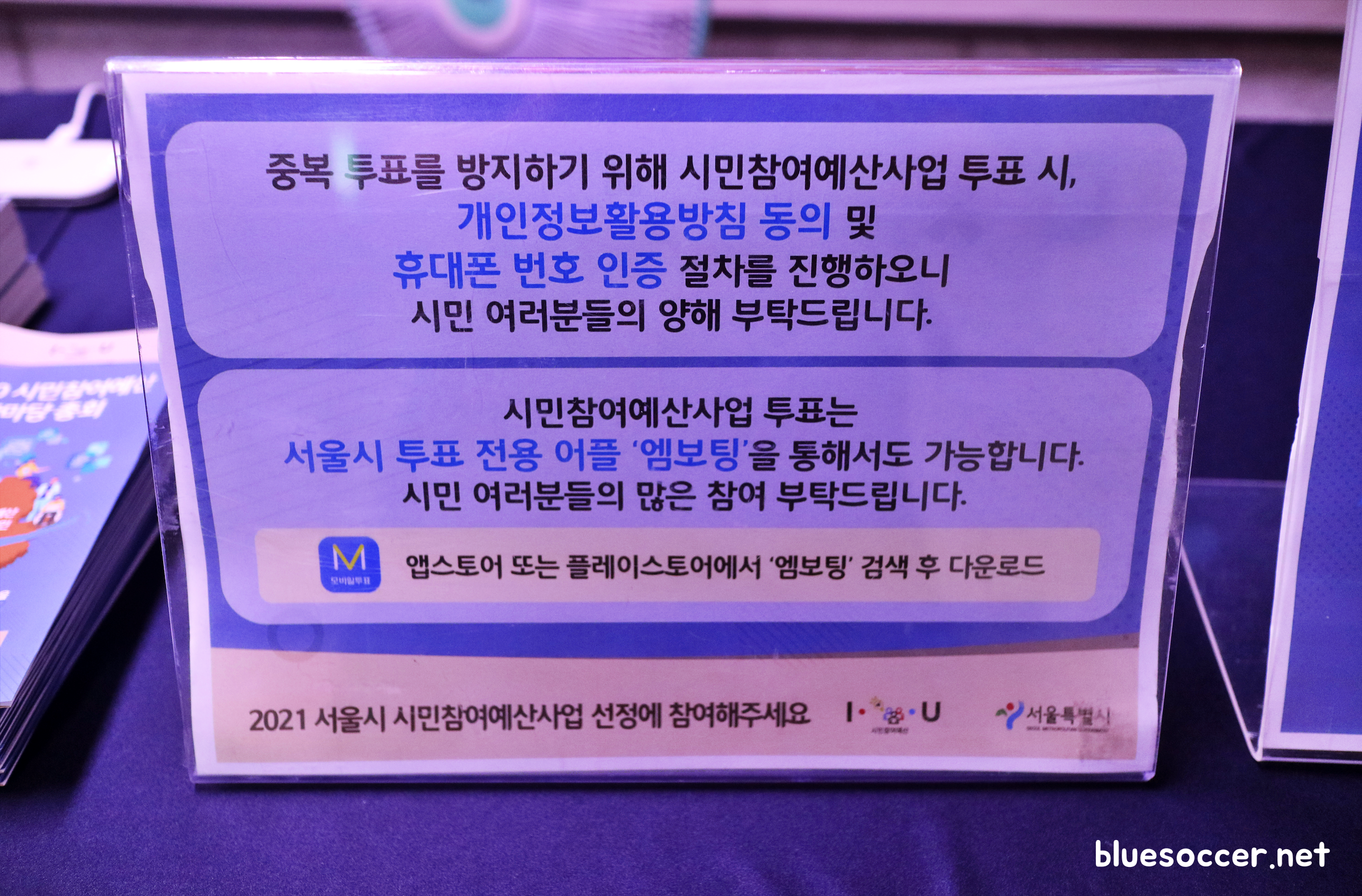 2021 시민참여예산사업 투표 SNS 인증이벤트 시청역 현장투표소에서는 테이블에 가림막이 설치됐습니다. 코로나19 이후 은행에서 고객과 은행원 마주보는 테이블 가운데에 가림막이 설치되어 있는 것처럼 이곳에서도 가림막 모습을 볼 수 있습니다. 관계자분의 안내를 받을 때 안심하실 수 있습니다. 물론 마스크 착용은 필수입니다.