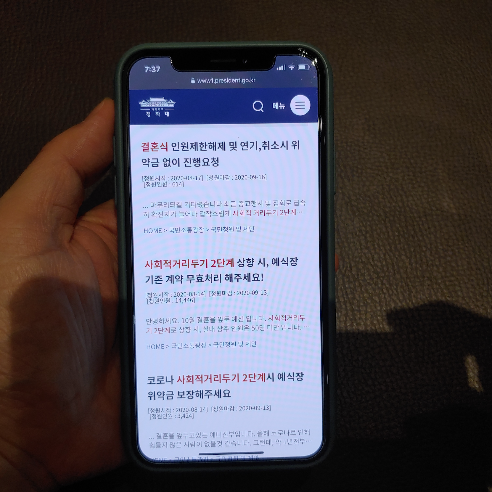 [사진 = 청와대 국민청원 공식 홈페이지에서는 사회적 거리두기 2단계 예식장 기존 계약 무효처리 원하는 청원이 1만 4천여 명 참여했습니다. 그와 더불어 예식장 위약금 보장해달라는 청원(약 3천 4백 명) 또한 참여한 사람이 꽤 있습니다. 이는 사회적 거리두기 2단계 결혼식 인원 제한 있음을 알 수 있습니다. 실내 50인 이상, 실외 100인 이상일 경우 금지되기 때문입니다. 이러한 조치로 인하여 예식장 위약금 보장 원하는 목소리가 청와대 국민청원에 올라오는 게시물을 통해 제기됐습니다. (C) 청와대 국민청원 공식 홈페이지]