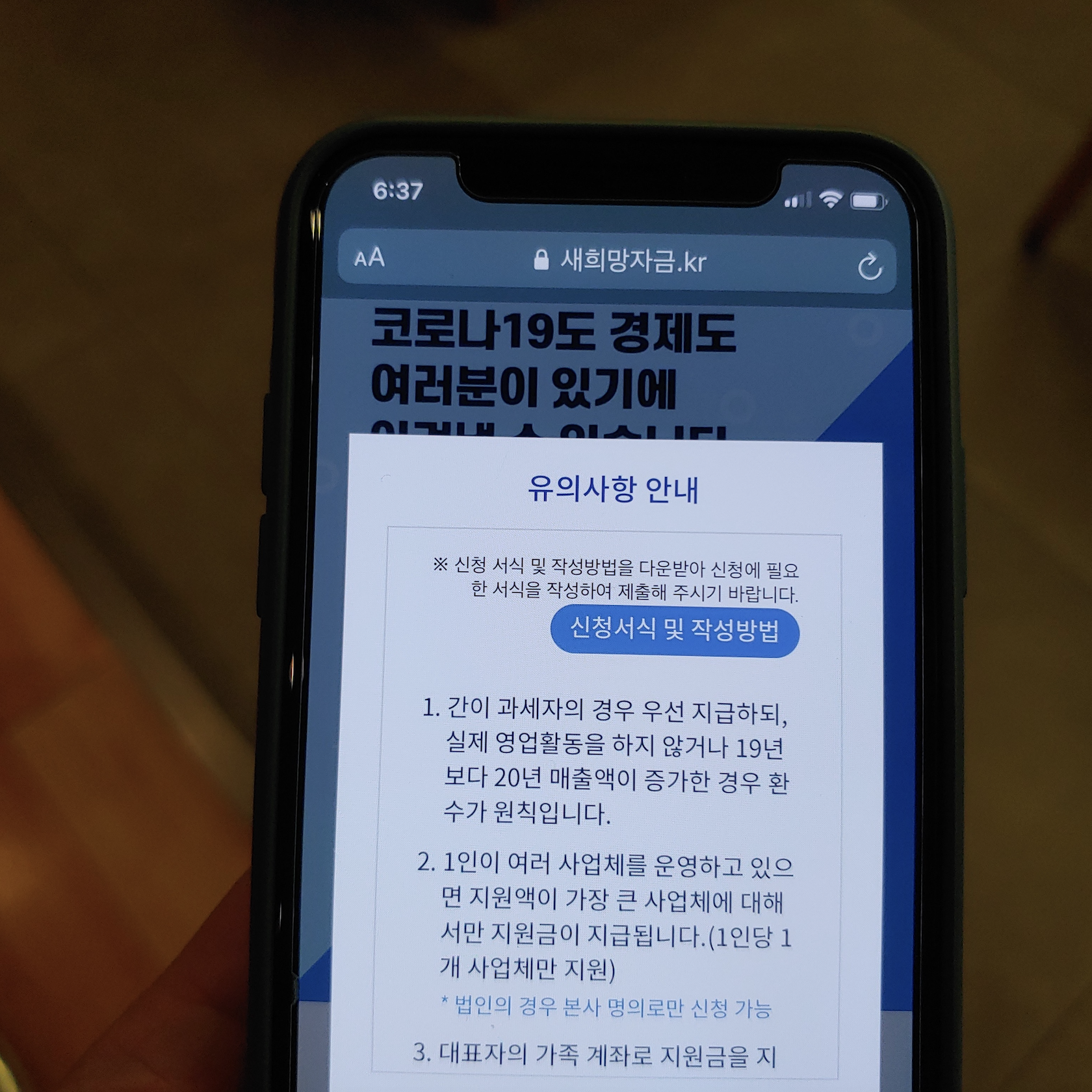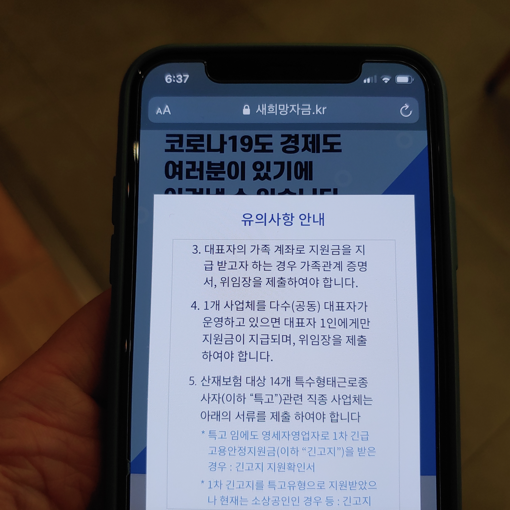[사진 = 소상공인 새희망자금 신청 시 유의사항 이렇습니다. 간이과세자는 실제로 영업활동을 하지 않거나 지난해보다 올해 매출액 증가한 경우 환수 원칙이며, 1인당 1개 사업체만 지원되며, 대표자 가족 계좌로 지원금 지급 받고 싶다면 가족관계증명서 및 위임장 제출 필수입니다. 산재보험 대상 14개 특수형태근로종사자(방문판매원, 방문교사, 학습지교사, 택배기사, 신용카드 회원모집인 등) 관련 직종 사업체는 관련 서류를 따로 제출해야 하며, 본인인증 가능한 공인인증서 or 휴대전화기 필요하다고 합니다. (C) 소상공인 새희망자금 공식 홈페이지]