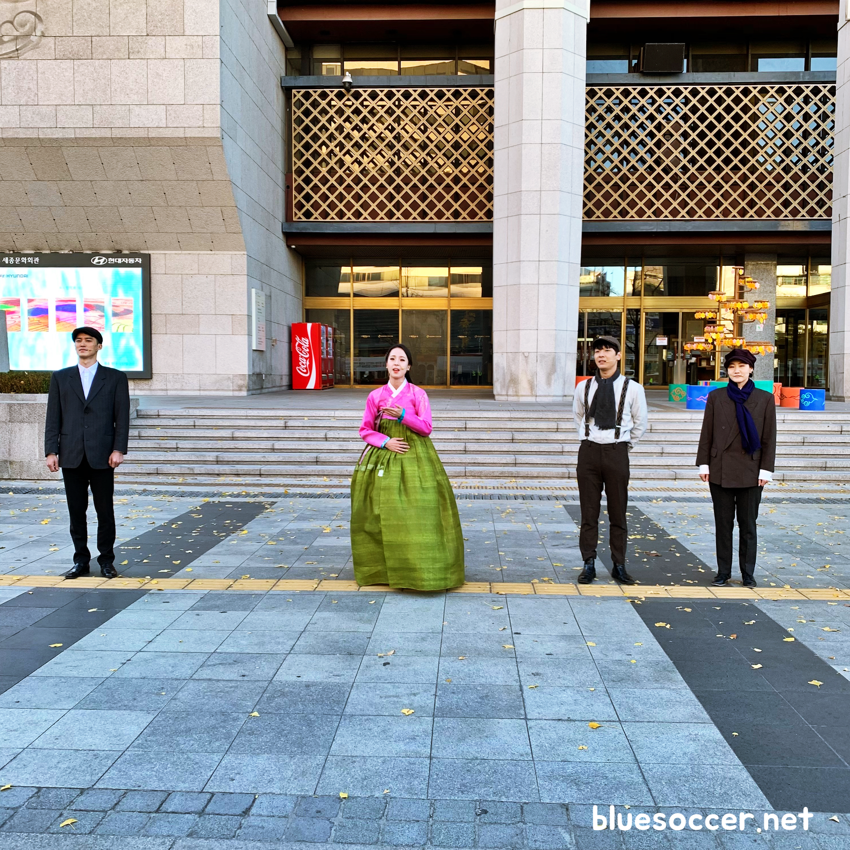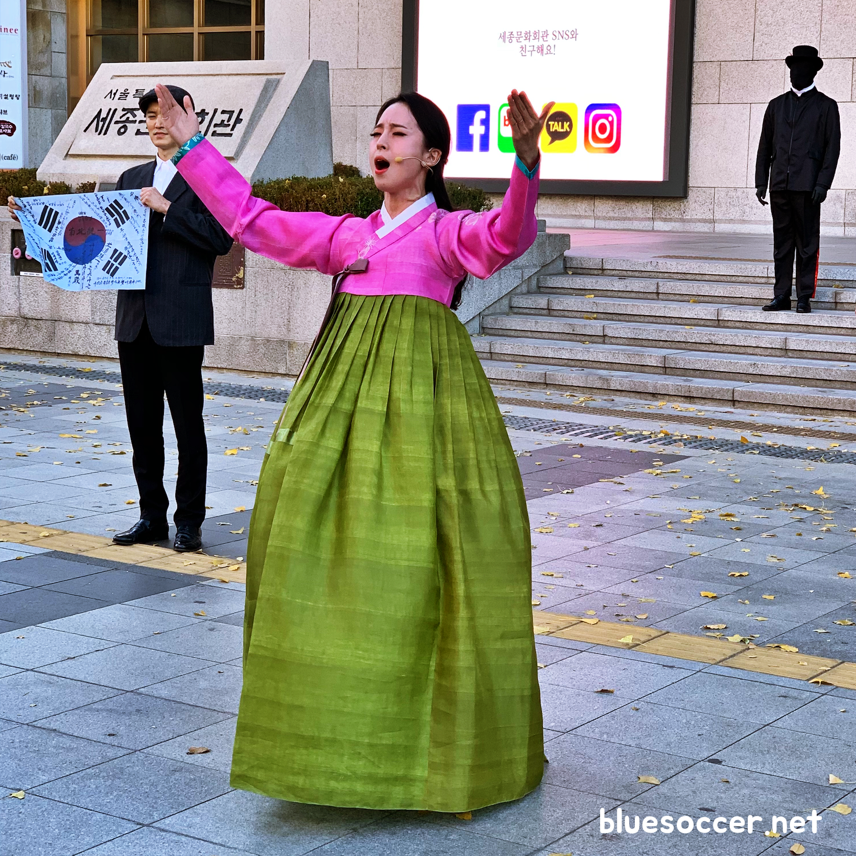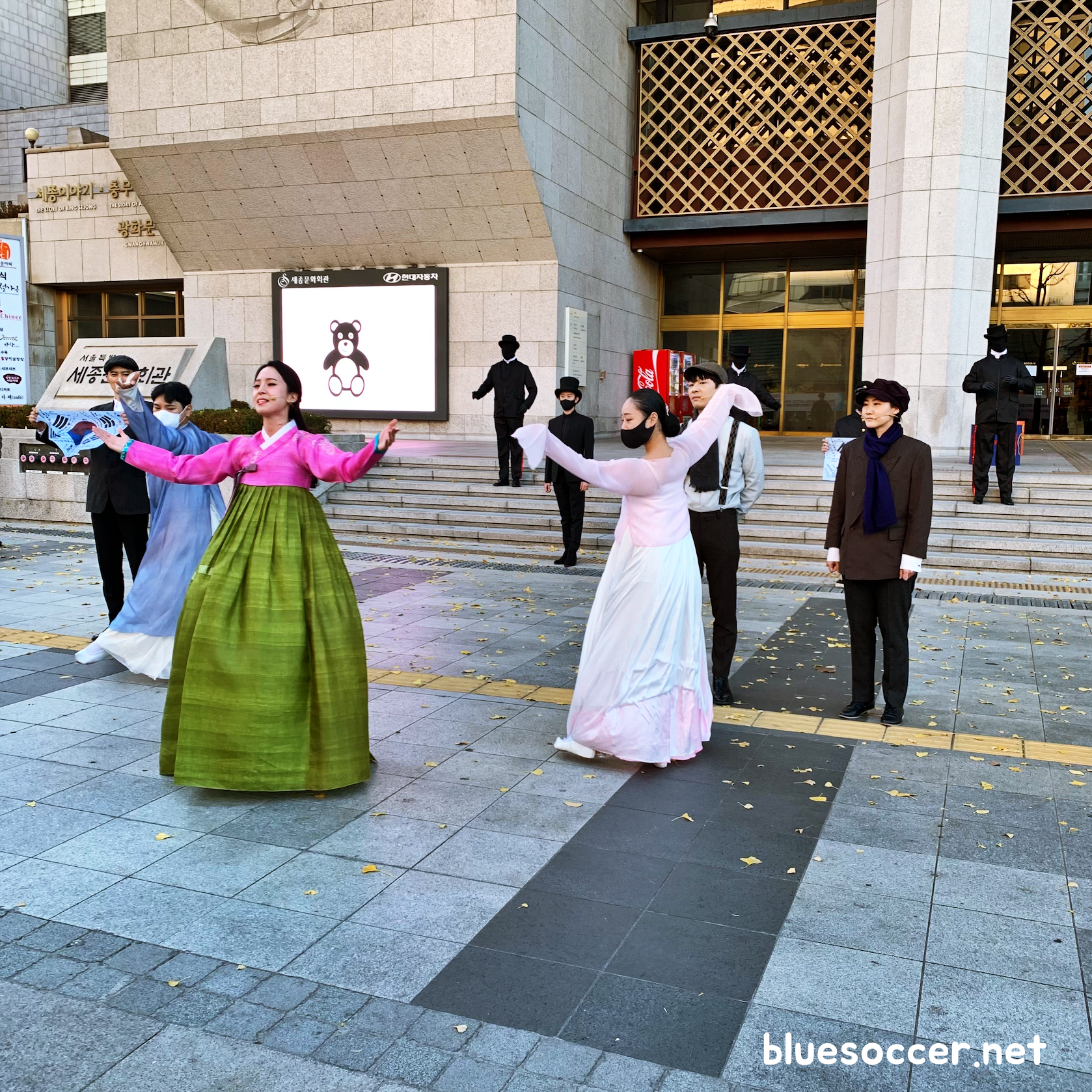 경복궁 앞에서는 전통무용 공연을 관람했습니다. 아픔을 치유하고 미래를 축복하기 위한 메시지를 담았습니다.