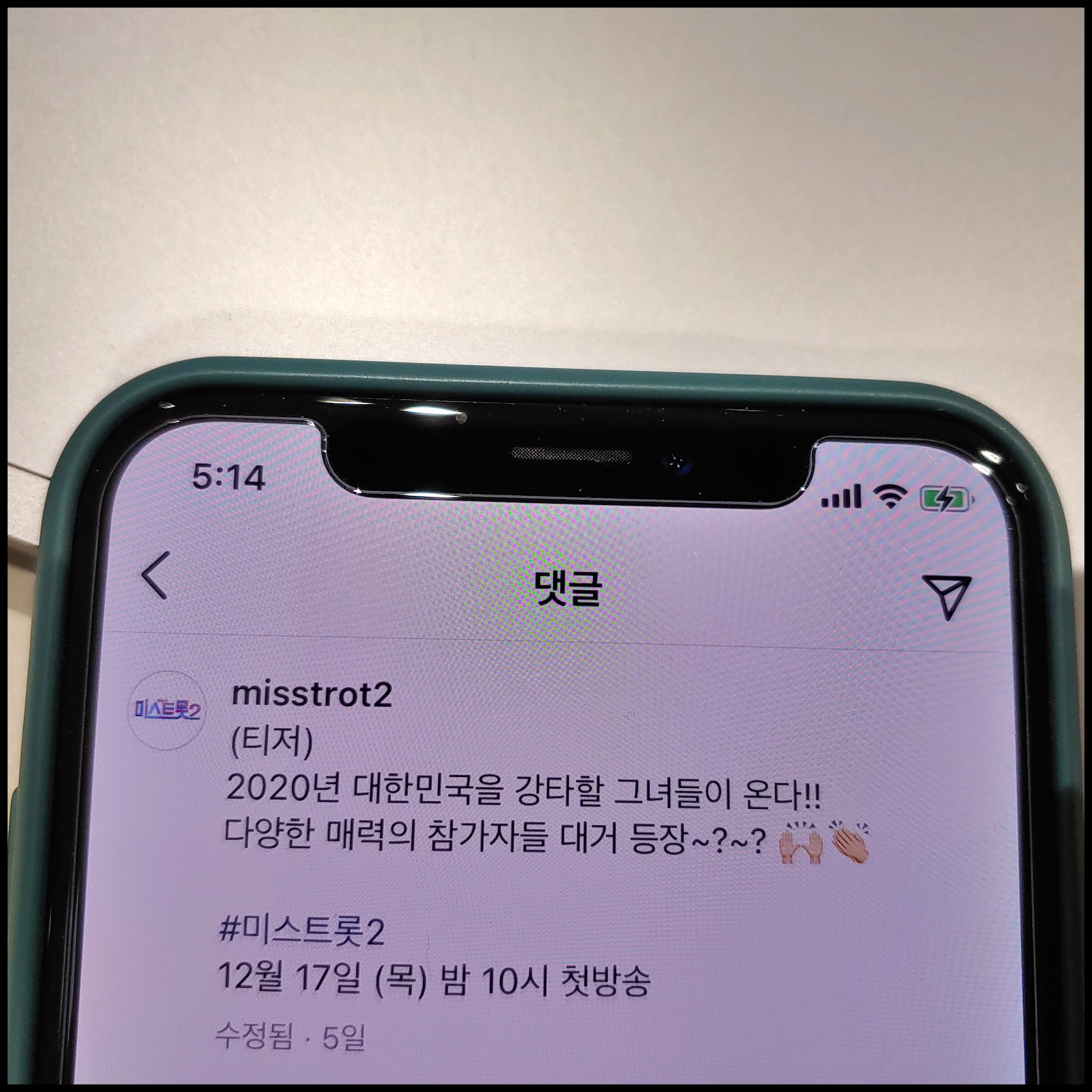 [사진 = 2020년 12월 17일 오후 10시부터 TV조선 미스트롯 1회 방영됩니다. 사진은 저의 스마트폰 달력이며 2020년 12월 17일을 가리킵니다. (C) 나이스블루]