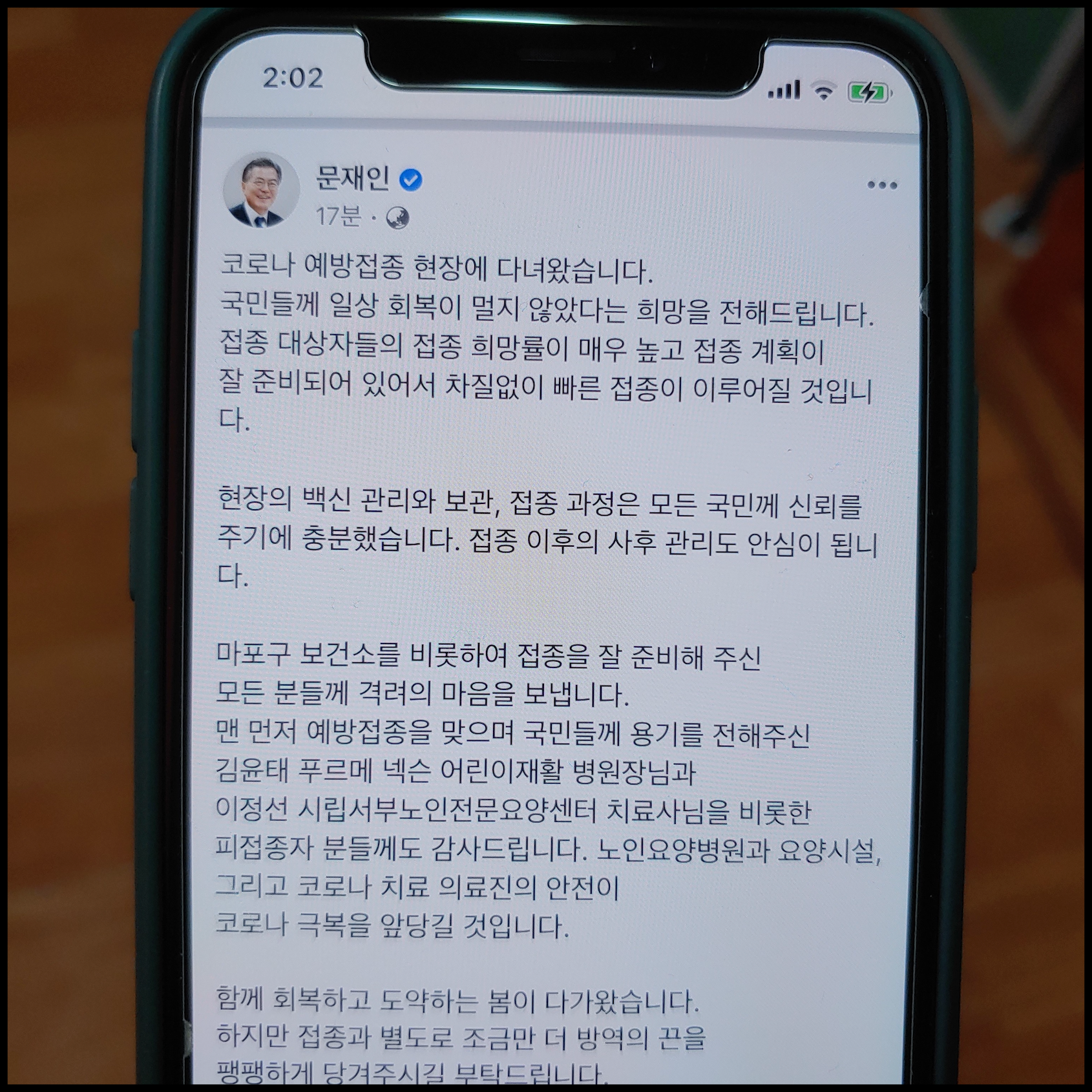 [사진 = 문재인 대통령은 2월 26일 공식 페이스북을 통해 코로나 예방접종 현장에 다녀왔다고 전했습니다. 국민들께 일상 회복이 멀지 않았다는 희망을 전한다고 밝히면서 백신 접종 대상자 접종 희망률이 매우 높으며 접종 계획 잘 준비되어 있다고 전했습니다. 빠른 접종이 차질없이 진행될 것이라고 전하면서 피접종자 분들에 대한 감사함을 표현했습니다. 그러면서 접종과는 별도로 방역의 끈을 팽팽하게 당겨야 한다고 언급했습니다. (C) 문재인 대통령 공식 페이스북]