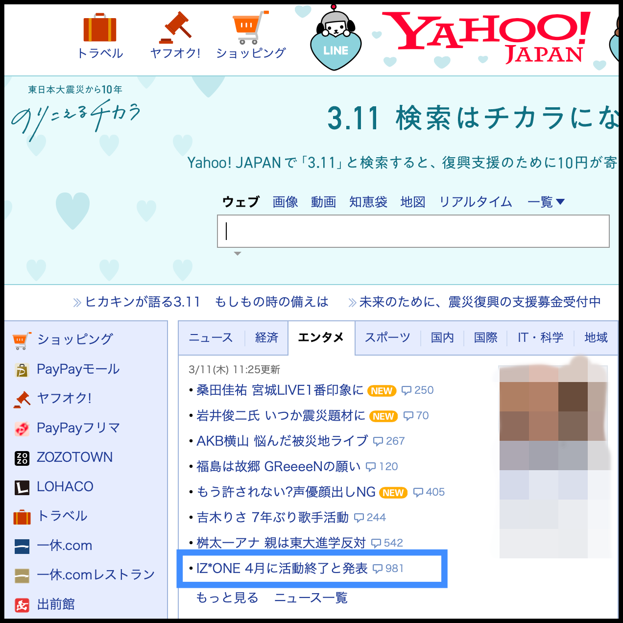 [사진 = 3월 11일 야후재팬 엔터 섹션에서는 아이즈원 4월 활동 종료 소식이 메인에 떴습니다. 지난 10일 Mnet 아이즈원 해체발표 소식이 일본에서도 화제가 되는 중임을 알 수 있습니다. (C) 야후재팬 공식 홈페이지(yahoo.co.jp)]