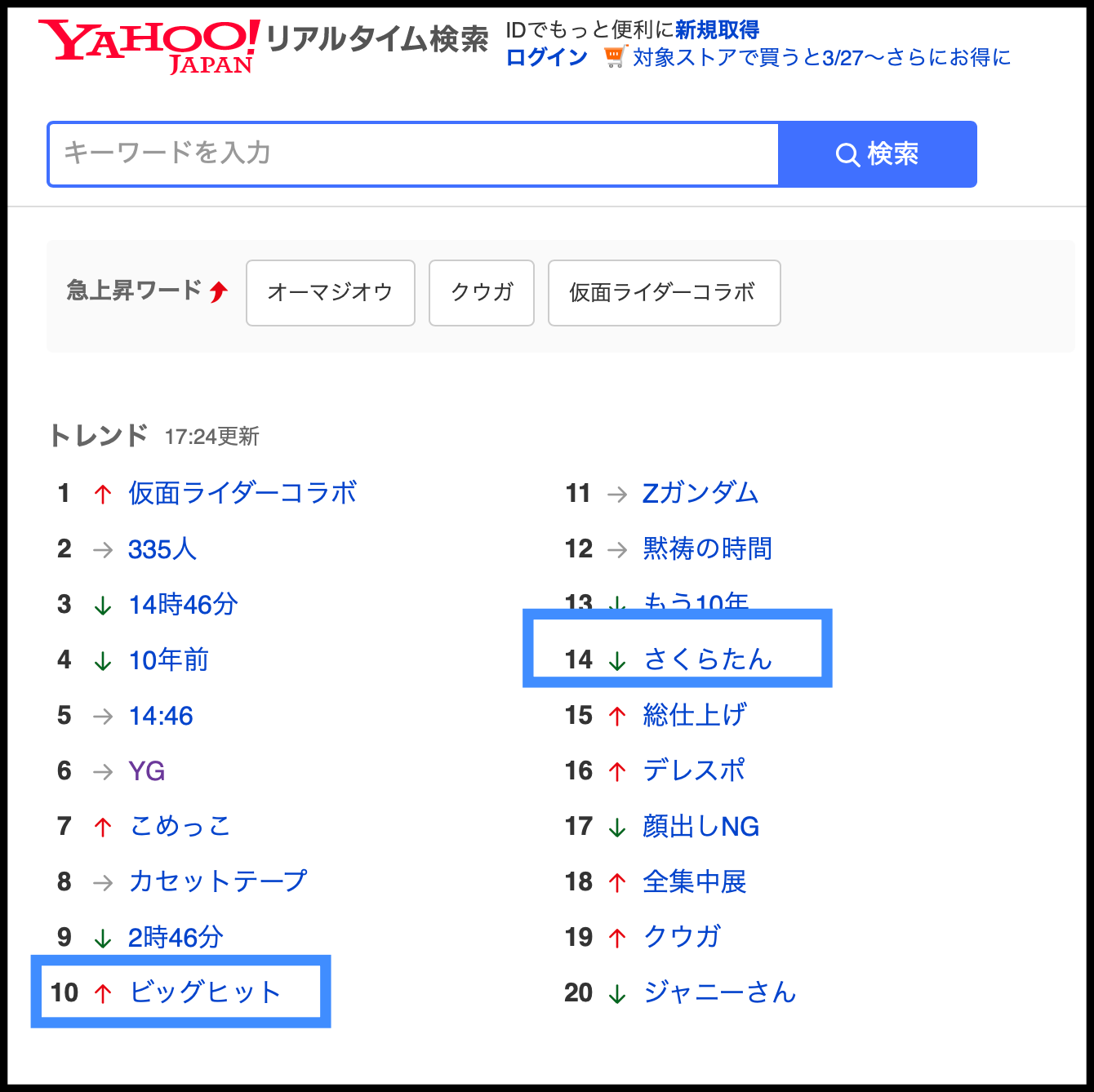 [사진 = 3월 11일 오후 일본 최대의 포털사이트 야후재팬 실시간 검색어에서는 YG, 빅히트, 사쿠라 키워드가 떴습니다. 미야와키 사쿠라 같은 경우에는 이름이 아닌 사쿠라탄(さくらたん)이라는 별칭으로 떴습니다. 현지 일본 연예계에서는 미야와키 사쿠라 빅히트 계약 여부가 눈길을 끄는 상황입니다. 아직 빅히트에서는 결정된 바 없다는 입장을 밝혔으나 아이즈원 온라인 콘서트 및 해체 이후의 상황이 궁금해집니다. 현재 아이즈원이 활동 중이기 때문에 이러한 반응을 보인 것으로 보입니다. 야후재팬 실시간 검색어에 YG가 뜬 이유가 무엇인지 알 수 없으나 일본 누리꾼들 사이에서 한국 대기업 기획사들을 눈여겨 보는 것은 분명합니다. (C) 야후재팬 공식 홈페이지(yahoo.co.jp)]