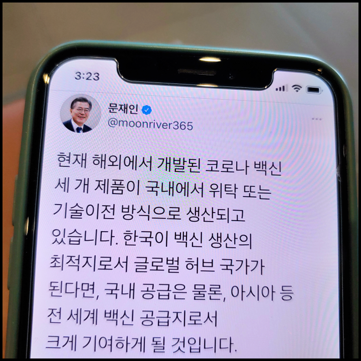[사진 = 문재인 대통령은 지난 5월 3일 트위터를 통해 한국 인구 두 배 분량의 백신을 이미 확보했으며 백신 도입 물량 최대한 효과적으로 활용하면 상반기 1,200만 명 접종 목표를 1,300만 명으로 상향할 수 있을 것이라는 보고를 받았다고 밝혔습니다. 이어 5월에는 화이자 백신이 주 단위로 국내에 안정적으로 공급되며 아스트라제네카 백신은 당초 계획보다 더 많은 물량이 앞당겨 들어온다고 언급했습니다. (C) 문재인 대통령 공식 트위터]