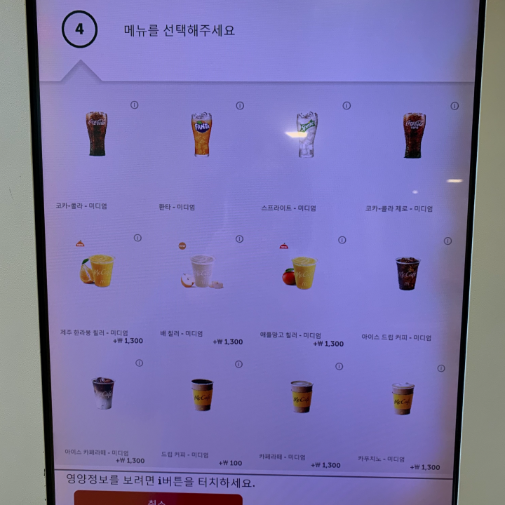 자판기로 주문을 해보니 소스는 선택이 가능한 듯 합니다. 소스는 2번과 3번에서 선택할 수 있으며 총 2개까지 구입 가능합니다. 음료수도 선택할 수 있습니다. 4번에서는 일부 음료(제주 한라봉 칠러 - 미디엄, 아이스 카페라떼 - 미디엄 등)는 1,300원 추가로 납부해야 하며 드립 커피- 미디엄도 100원 추가입니다. 저는 코카콜라 제로 - 미디엄 주문했습니다. 5번에서는 후렌치 후라이 - 미디엄 주문했는데 일부 메뉴는 돈을 추가로 지불해야 합니다.