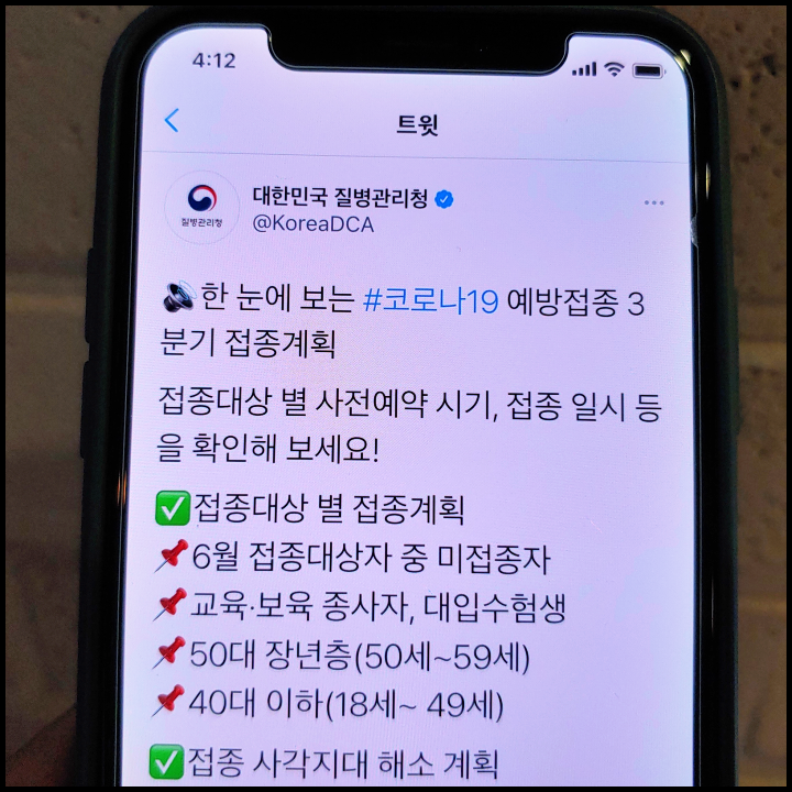 [사진 = 대한민국 질병관리청 공식 트위터에서는 코로나19 예방접종 3분기 접종계획 공개했습니다. 한국에서 이번 3분기에 대규모 인원의 백신 접종이 예정되어 있습니다. 알고보니 40대 이하 백신 접종 시기 또한 공개됐습니다. 8월부터 예약 시작하며 우선 접종자 접종 완료되는 8월 이후부터 접종 시작된다고 합니다. 50대 백신 접종 예약 주로 7월에 집중되어 있기 때문에 40대는 그 이후인 8월에 접종 예약을 할 수 있는 것으로 보입니다. 연령별 백신 접종이 75세 이상에서 60~74세, 50대 순서로 진행되고 있으니 말입니다. (C) 대한민국 질병관리청 공식 트위터]