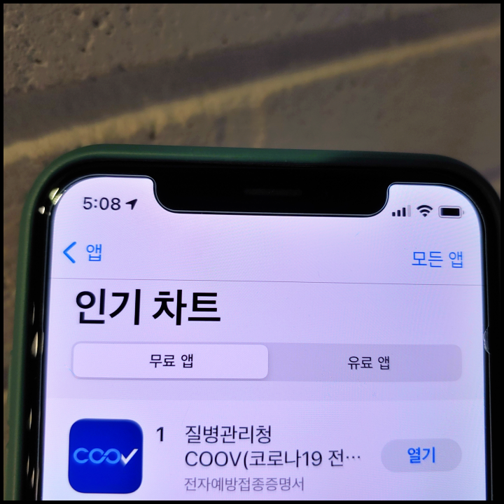 [사진 = 앱스토어에서는 질병관리청 COOV 앱이 인기차트 무료 앱 분야에서 1위 기록중입니다. 많은 분들이 백신 접종 인증하기 위해 해당 앱을 아이폰에서 설치중입니다. (C) 앱스토어]