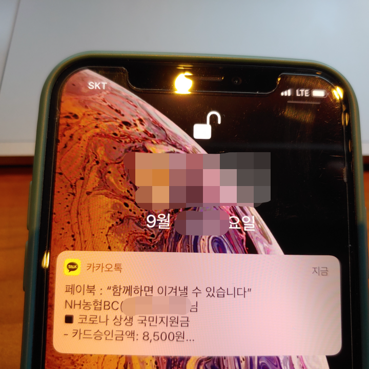제가 재난지원금 지급 받았던 카드로 결제했더니 스마트폰 알림이 이렇게 왔습니다. 카카오톡을 통해서 결제 및 재난지원금 잔액조회 정보가 뜹니다. 앞에서도 언급했지만 제가 머릿속으로 잔액을 기억하지 않아도 카카오톡으로 뜨기 때문에 편리합니다.
