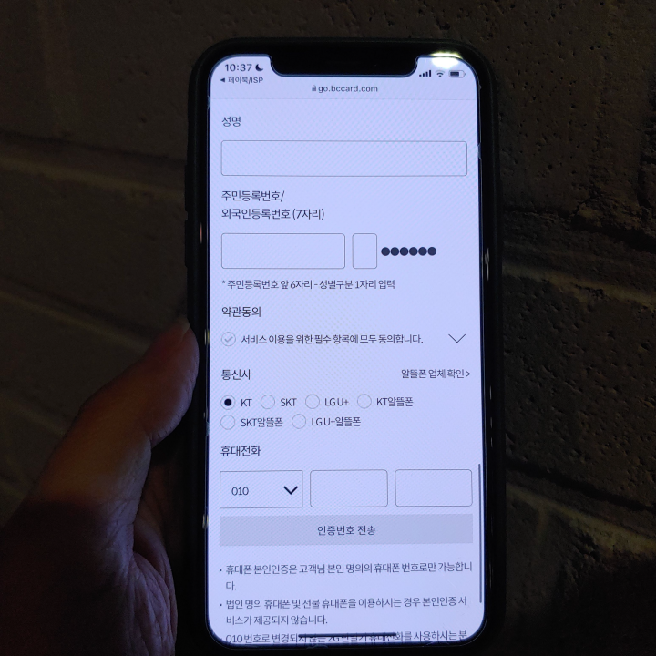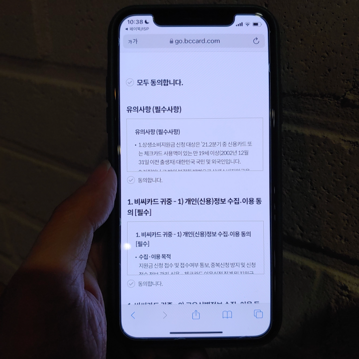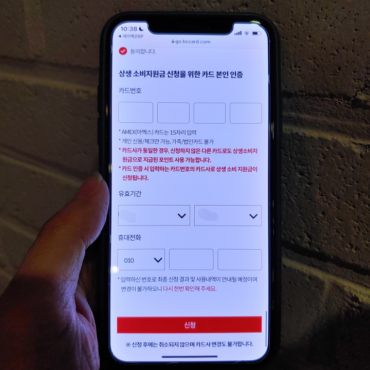 그 이후에는 상생지원금 신청 진행하면서 이러한 절차를 거치면 됩니다. 동의 항목에 체크했으며, 저의 개인정보 입력했으며, 휴대전화 인증했으며, 카드번호 및 유효기간 입력했습니다.