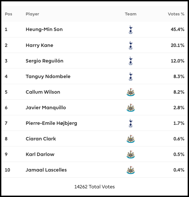 [사진 = 프리미어리그 공식 홈페이지에 따르면 뉴캐슬전 손흥민 킹오브더매치(KING OF THE MATCH) 소식을 전했다. 팬들이 투표를 할 수 있으며 총 14,262표 중에 45.4%가 손흥민, 20.1%가 케인, 12.0%가 세르히오 레길론에게 향했다. 이는 손흥민 향한 해외 축구팬들의 응원이 굳건함을 알 수 있다. (C) 프리미어리그 공식 홈페이지(premierleague.com)]