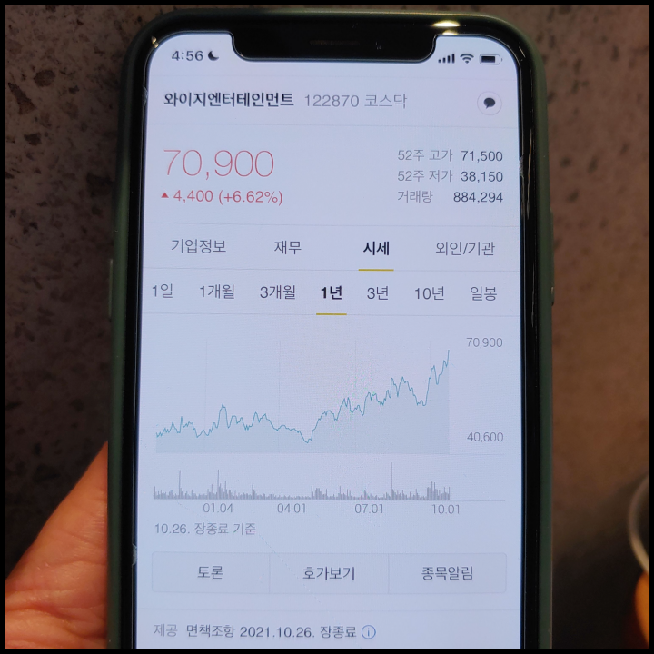 [사진 = 위드코로나 관련주 YG 주가 최근 1일, 1개월, 1년 추이입니다. 10월 26일 70,900원으로 마무리했으며 지난 1년 전과 비교해서 많이 올랐습니다. YG는 블랙핑크, 트래저 등이 소속됐습니다. (C) 다음 앱]