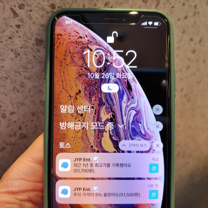저 같은 경우 토스 앱을 통해서 제가 평소에 관심을 두던 종목들에 대하여 이렇게 체크합니다. 10월 26일 오늘 같은 경우 JYP 주가 오전 10~11시 즈음에 최근 1년 중 최고가 기록했습니다.(당시 51,700원) 종가는 더 올라갔습니다. 53,400원으로 마무리하며 전날보다 4,400원(+8.98%) 상승했습니다. 불과 몇 개월 전까지 JYP 주가 3만~4만 원 사이에서 횡보했던 기억이 나는데 4만 원대에서 오르더니 이제는 5만 원대에 진입했습니다. 그 이유에 대하여 여러가지 해석이 나올지 모르겠는데 위드코로나 관련주 중에 하나가 JYP라고 볼 수 있습니다. 아울러 JYP 주가는 오늘이 역대 최고가입니다. JYP 주가 5만 원 넘은 것은 이번이 처음입니다.