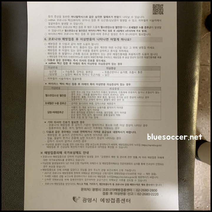 백신 접종 기관에 도착하면 예방접종 안내문을 받게 됩니다. 예방접종 전후의 주의사항이나 예방접종 후 발생 가능한 이상반응이 무엇인지 알 수 있습니다. 그중에 전신반응으로 발열, 피로감, 두통, 근육통, 매스꺼움/구토 등이 나타날 수 있다고 언급되어 있으나 접종 후 흔히 나타나는 반응으로 대부분 2~3일 이내 증상 사라진다고 안내됐습니다.