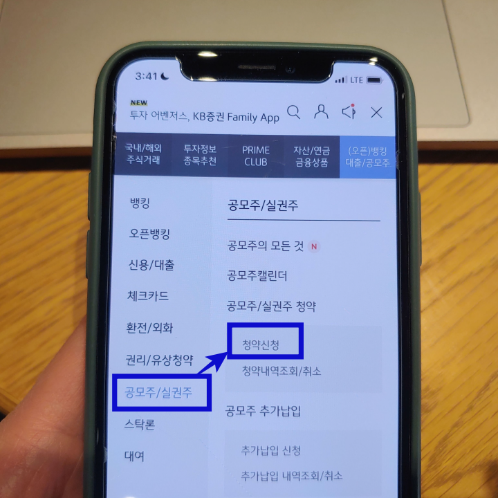 LG에너지솔루션 공모주 청약 방법 KB증권으로 하실 경우 이렇게 하시면 됩니다. 메뉴 상단에 있는 공모주 항목을 찾은 뒤, 그 밑에 있는 항목에 '공모주/실권주 청약'이라고 뜨면 그 밑에 '청약신청'으로 들어가야 합니다.