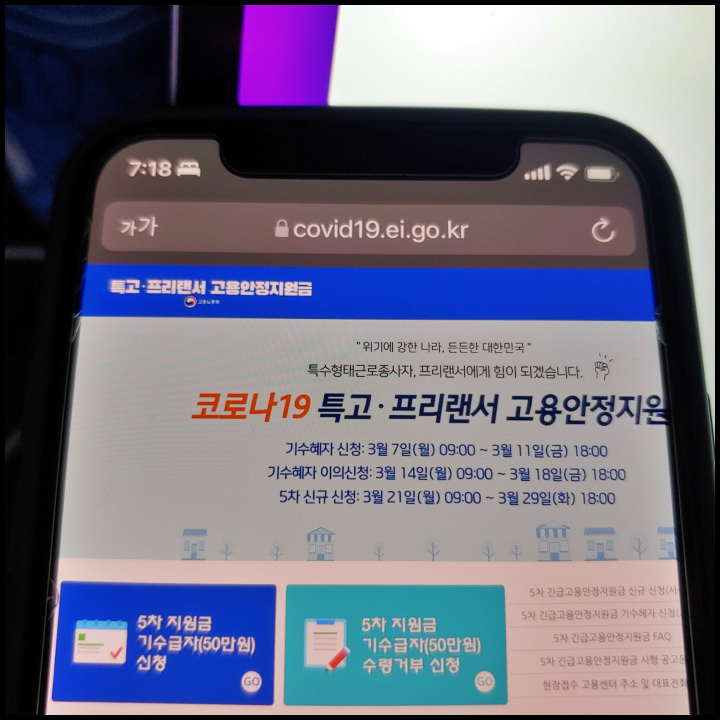 이 분들은 특고 프리랜서 5차 재난지원금 50만원 받게 됩니다. 온라인에서는 코로나19 긴급고용안정지원금 홈페이지를 통해서 신청할 수 있는데 PC에서만 할 수 있습니다. 만약 온라인이 아닌 방문 신청을 하고 싶다면 3월 10일 목요일 오전 9시부터 3월 11일 금요일 오후 6시까지 이틀 동안 인근 고용센터 방문해서 신청하셔야 하는데 신분증 및 통장사본 챙기셔야 합니다.