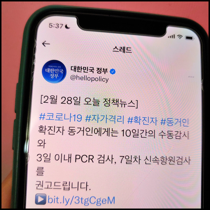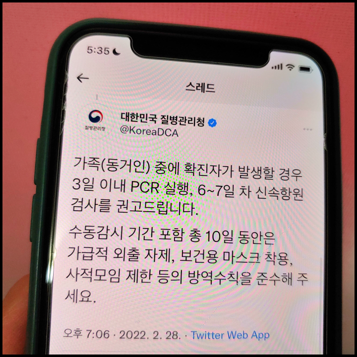 [사진 = 대한민국 정부 공식 트위터에서는 자가격리 기준 관련하여 확진자 동거인 10일간 수동감시, 3일 이내 PCR 검사, 7일차 신속항원검사 권고한다고 밝혔습니다. (C) 대한민국 정부 공식 트위터]